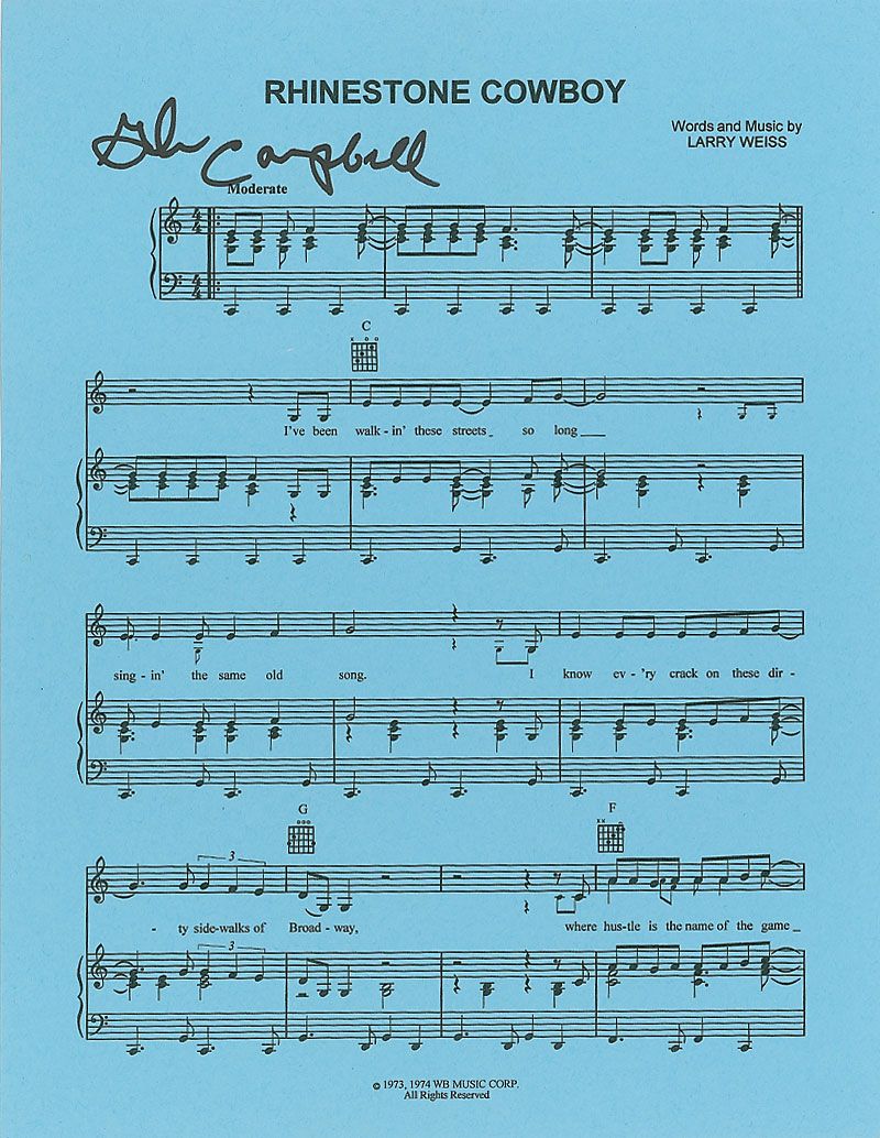 Sheet music to ‘Rhinestone Cowboy’ on three 8.5 x 11 blue sheets, signed at the top of the first page in black felt tip by Campbell. In very fine condition.