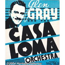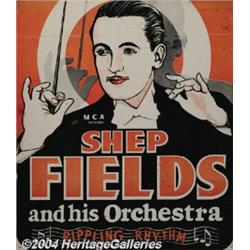 <B>Glen Gray, Shep Fields, and Sammy Kaye Unsigned Window Cards.</B></I> Glen Gray led the Casa Loma Orchestra, and they were the first band to appear on a radio program, "Camel Caravan", that featured a swing orchestra. A few of the great players who passed through the group were, Bobby Hackett, Pee Wee Hunt, Herb Ellis, Ray Eberle, Kenny Sargent, Sonny Durham, Red Nichols, and Larry Clinton. This card includes a likeness of Fields along with large block print of the band named. Pin holes at corners do not detract. Sammy Kaye achieved huge success leading one of the greatest "Sweet Bands", and his music was a favorite among those fans who came to dance. This unsigned card features a color image of the bandleader, plus his slogan, "Swing and Sway." The card is quite attractive. Minor defects include normal age wear, pin holes in each corner, and slight bending at the lower left hand corner. Saxophonist Shep Fields also led one of the best "Sweet Bands" of the 1930s, and at one point, Shep employed Sid Caesar on sax and Ken "Festus" Curtis, of future Gunsmoke fame, as the singer. This attractive, unsigned card has pinholes at each corner, some corner wrinkle at the bottom left corner, and a small missing piece at the upper left-hand corner. Also, there is a printing defect that shows a faint orange line from left to right, approximately 2 inches from the top of the card. The card also shows some normal age wear. 3 items <BR><BR><B>Important notice:</B> Heritage usually auctions material at the rate of 200-250 lots per hour. On some occasions eBay Live bid software or the Internet may not be able to keep up with the pace of the auction. We recommend placing a realistic absentee bid now as insurance to avoid disappointment. Occasionally the auctioneer may eliminate or reject an eBay Live bid, and the auctioneer may also reopen a lot after the close of the eBay live bidding (usually because we missed an audience bid), and may reject your bid even if it shows you as the winning bidder. By bidding via eBay Live, you agree that Heritage may award the lot to another bidder at its sole discretion under the circumstances described above or any other reasonable circumstances. Since eBay bids are not shown to us until we open the lot on the floor, we treat those bids just like floor bids. In most cases the floor responds before the eBay bid is presented to us, due to Internet lag time, so for consistency we have made it a policy that floor bids are always considered first over tie eBay live bids. Also please note that all Heritage lots purchased through eBay Live carry a 24.5% Buyer's Premium. Please make sure you read the Terms and Conditions before you bid.