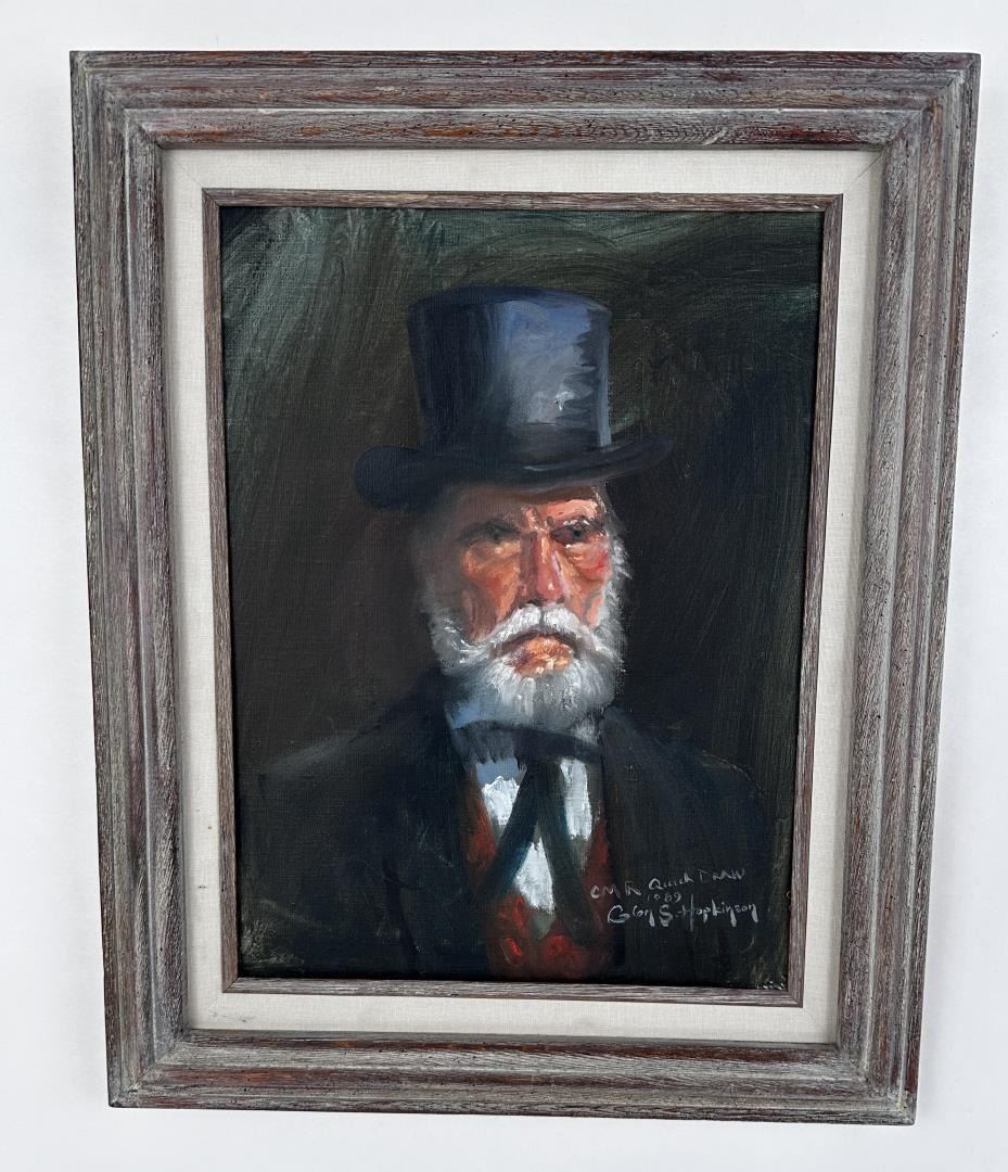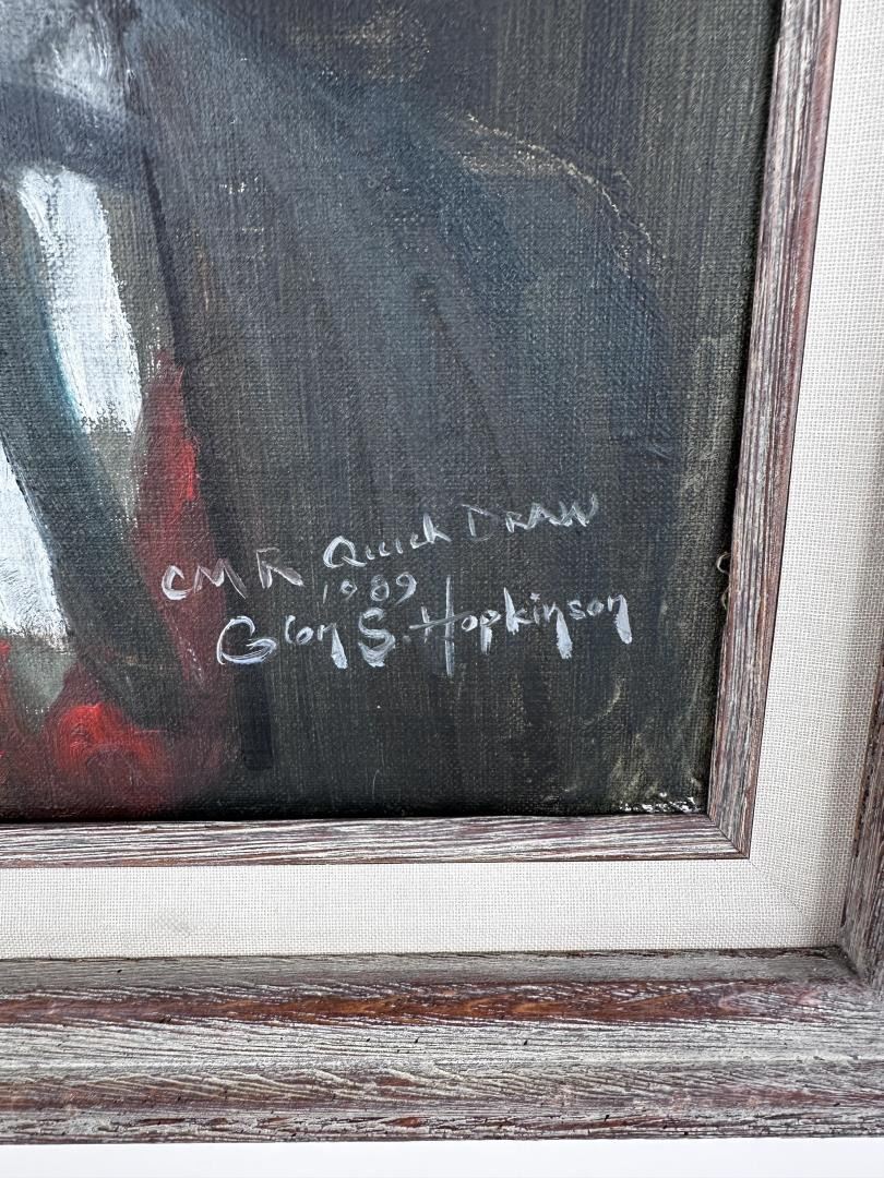 Charles M Russell Quick Draw 1989. Title is Howard E. Thomas Calgary Canada. 17" by 21" framed. Glen Spencer Hopkinson (Born 1946) is active/lives in Arizona, Wyoming. Glen Hopkinson is known for Landscape, western genre and animal painting. Glen Hopkinson was born in 1946 in Laramie, Wyoming, just a few miles from the old Mormon Trail. His parents, Harold Hopkinson and Vivian Hamblin, both of Fort Bridger, Wyoming, took their four children to Byron, Wyoming. Glen’s father was the Superintendent and Art Teacher of the local high school. Harold spent his off hours building his art career. Glen would recount, "My dad’s studio was a haven of visual pleasure for me. When I was little and wanted to paint, he would get out some of his older brushes and water colors for me to use. I would literally be ‘underfoot’ painting my paintings while he painted his. I would say my art training began at the foot of my father from the time I was two or three years old!" After his early years of informal art training, Glen began his more serious art education during high school under the tutelage of his father. He also studied with a famous Saturday Evening Post illustrator, Robert Meyers as well as Donald “Putt” Putman. Glen served a mission for the L.D.S Church in Korea for two-and-one-half years in the late 1960’s. Part of his mission saw him as editor and illustrator for the monthly mission magazine. Soon after arriving back home, he married his high school sweetheart, Pamela Cozzens. After graduating from B.Y.U with a Bachelor of Fine Arts Degree. Glen, Pam, and their young son Travis moved to Salt Lake City where Glen worked as an illustrator. It was in the Spring of 1972 when Glen received a portrait commission that caused him to move his family to Cody, Wyoming. They say that fools rush in where angels fear to tread, and Glen and Pam decided that a painting sale here or there could be the beginning of an art career. With “true grit”, they began the uneasy yet exciting adventure of painting paintings, attending art shows, making sales, and most importantly, building their family. Glen’s art career flourished. Painting commissions and sales at art shows and galleries provided the means for Pamela to be at home with their children while Glen was able to devote full-time to painting in his art studio. Blessed with five children, Travis, Heather, Todd, Summer, and Holly, Glen often found himself with his own little ones underfoot, begging for brushes and paint. Glen and Pam moved their family to Mesa, Arizona in 1988, yet still spending much of their summers in Wyoming. Their children grew, left home, and soon Glen had a growing generation of grandchildren visiting his studio. Thirty years (and then some) have quickly gone by and the artist continues to paint his paintings with a mix of realism and impressionism, always excited about the work he is doing and grateful to God for allowing him the great privilege of sharing an artist’s view of our world and our ancestors’ world through his paintings. His artwork is in permanent collections of the Montana and Wyoming Historical Society museums, the Whitney Museum of Western Art, and many corporate and private collections throughout the world .