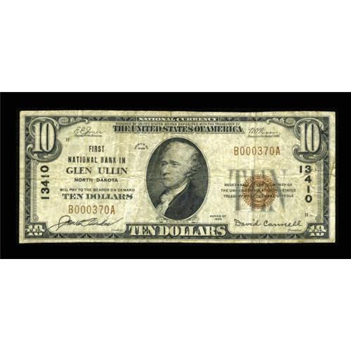 <B>Glen Ullin, ND</B></I> - $10 1929 Ty. 1 <B>First NB</B></I> Ch. # 13410<BR> An evenly circulated <B>Fine</B></I> example from the only collectible bank in this small community.<BR><BR><b>Shipping:</b> Coins & Currency (<a target="_blank" href="http://www.heritageauctions.com/common/shipping.php">view shipping information</a>)