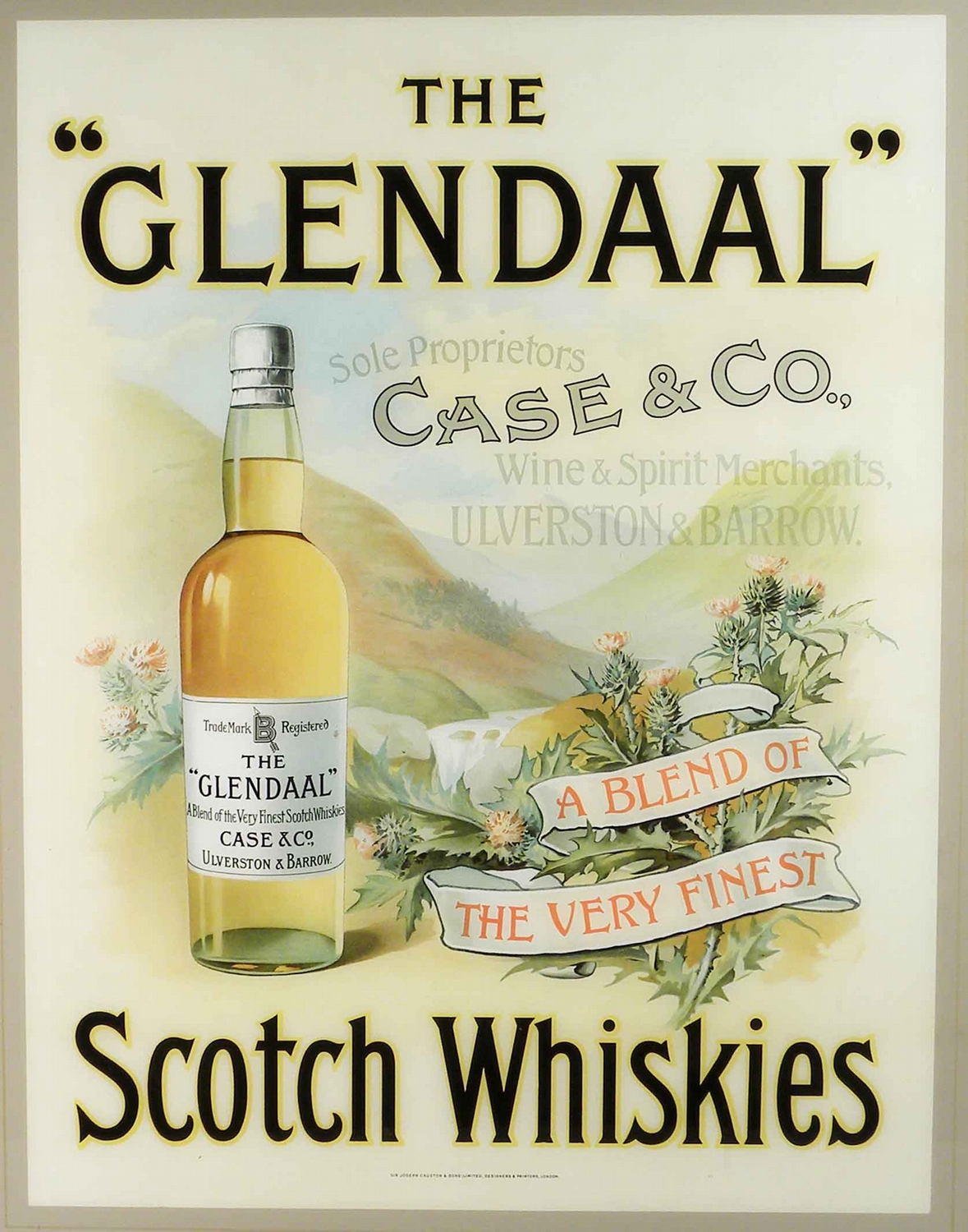 Glendaal Scotch Whiskies Reverse Glass Sign. Case & Co. Proprietors. Ulverston & Barrow. Original paper sticker on the back. Mint condition. 18 X 24 inches image only.