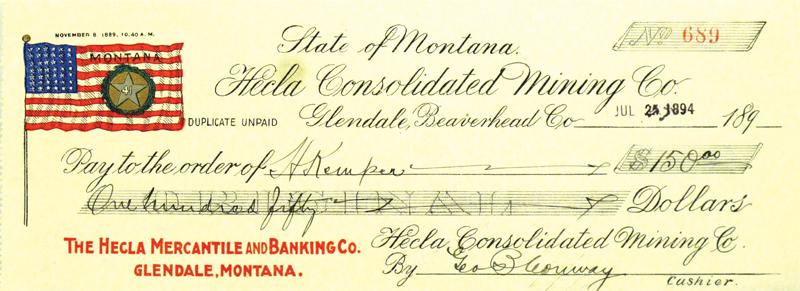 Hecla Consolidated Mining Co. check payable to H. Kemper for $150. Signed by Geo. Bleoriway, Cashier. No. 689, dated July 25, 1894. Colored vignette on left of state flag of Montana with notation as 41st state and date statehood granted.