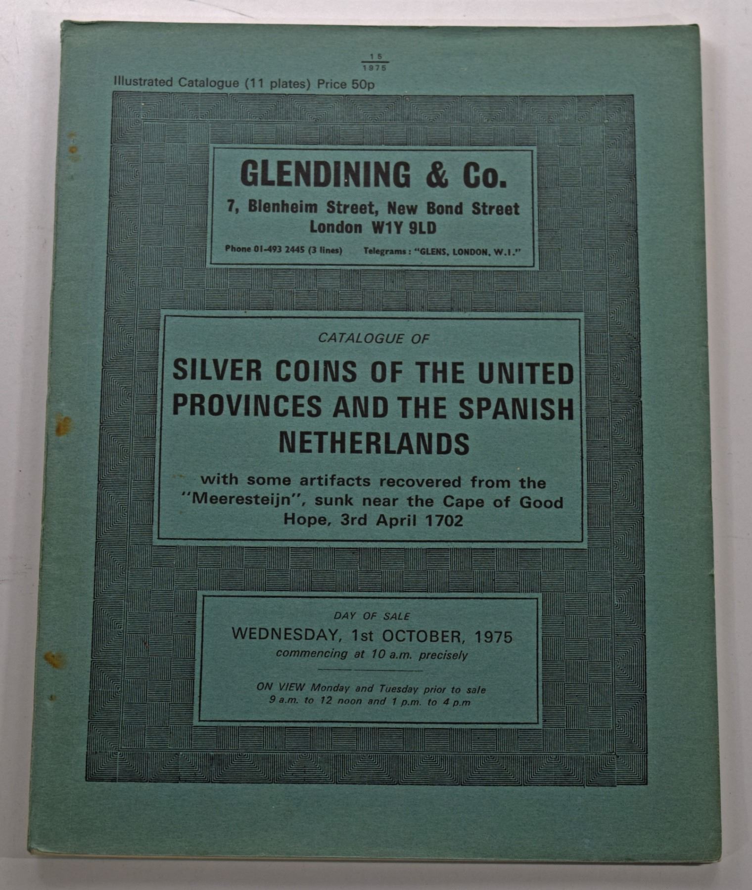 Glendining & C0. CATALOGUE OF SILVER COINS OF THE UNITED PROVINCES AND THE SPANISH NETHERLANDS WITH SOME ARTIFACTS RECOVERED FROM THE MEERESTEIJN, SUNK NEAR THE CAPE OF GOOD HOPE, 3RD APRIL 1702. October 1, 1975. 8vo, 35 pages; Softcover; PRL; This auction catalog includes 365 lots of coins (mostly Silver Riders and ducatons) and 12 lots of artifacts from the “Meeresteijn”, a Dutch East Indiaman which was wrecked near Cape Town, South Africa in 1702. Subject: History - Sunken Treasure