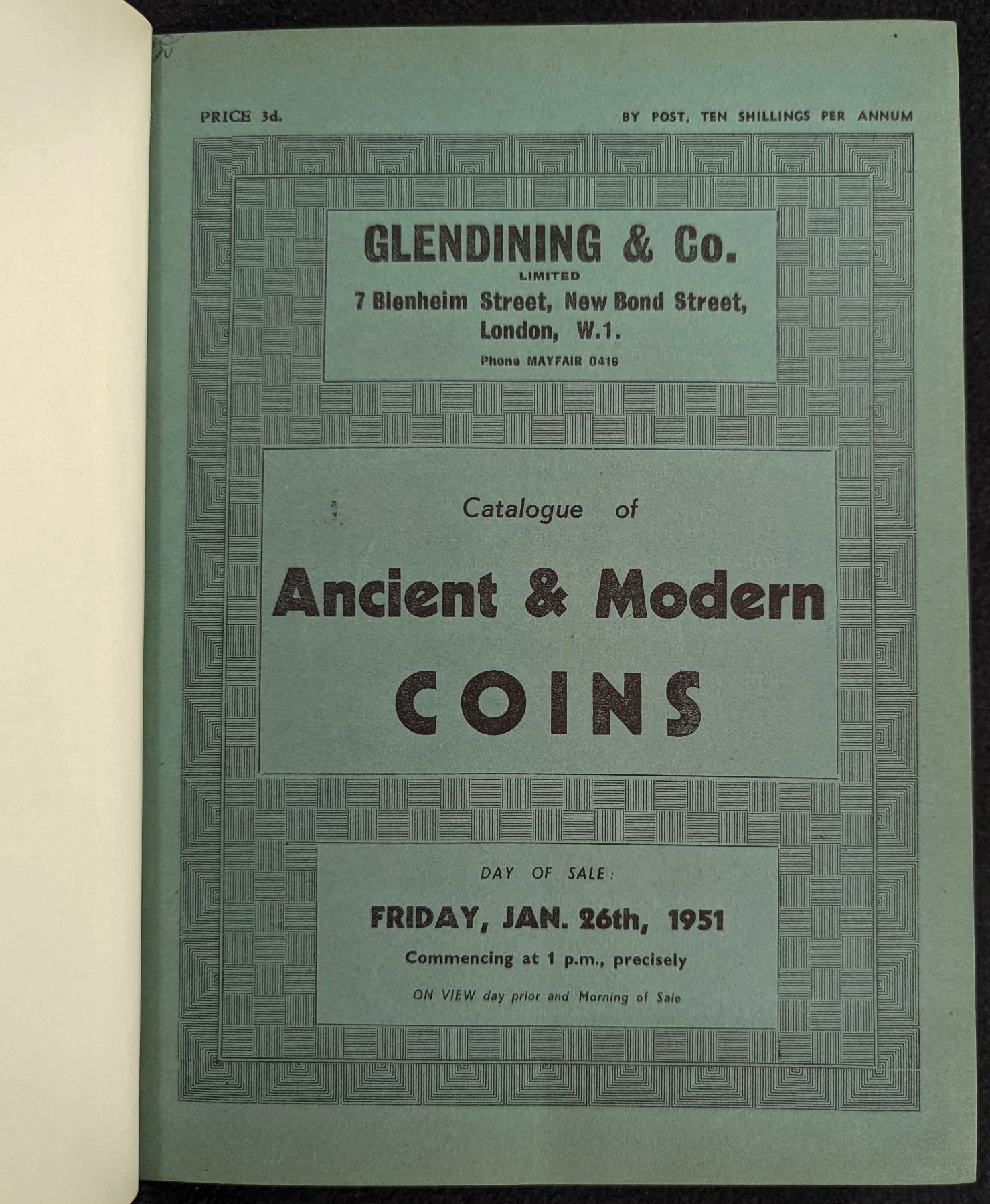 (1) Glendining & Co. Catalogue of Ancient and Modern Coins. January 26, 1951. 1-243 lots. 19, (1) pages. London. Original green printed card covers. Priced catalog. Fine.