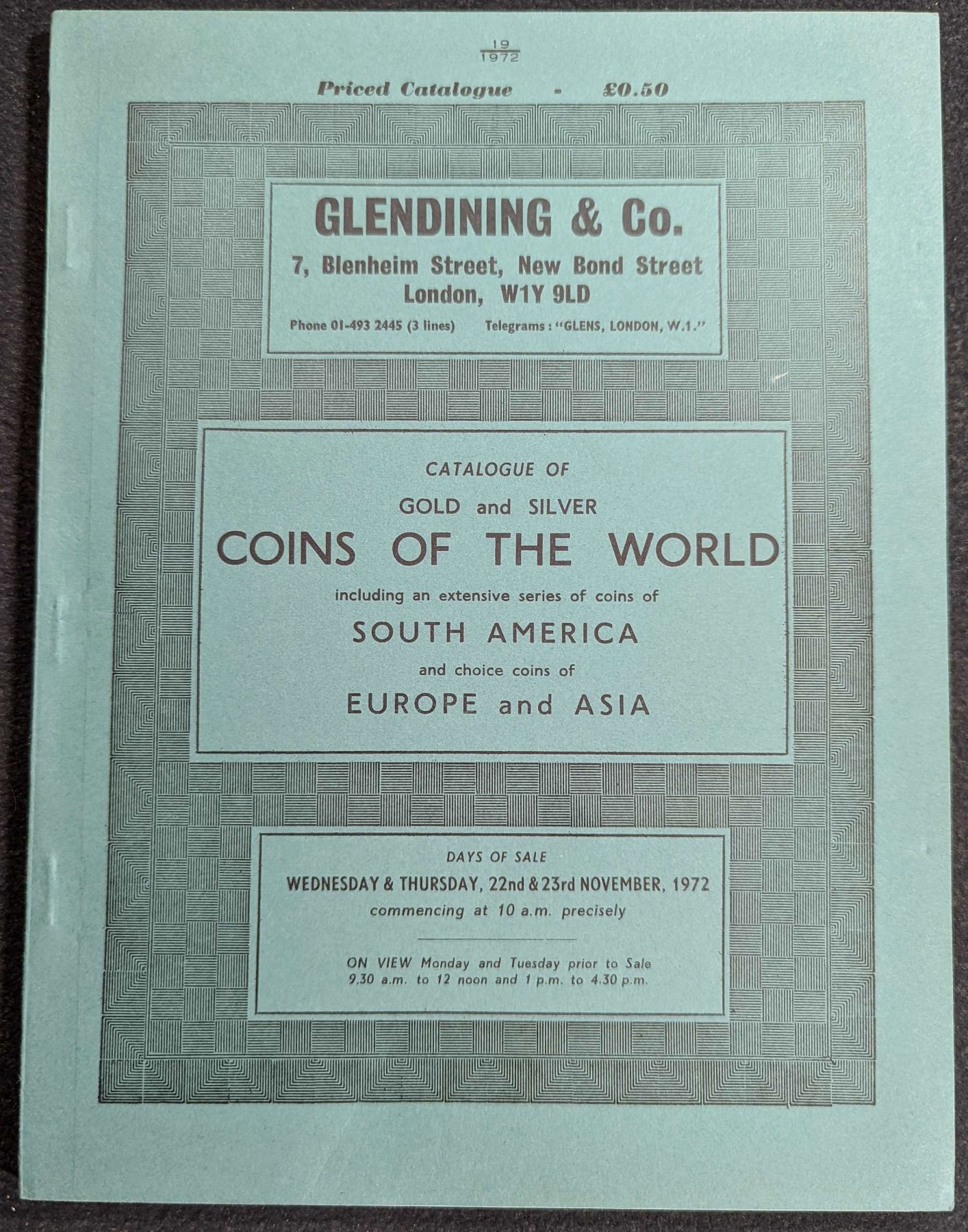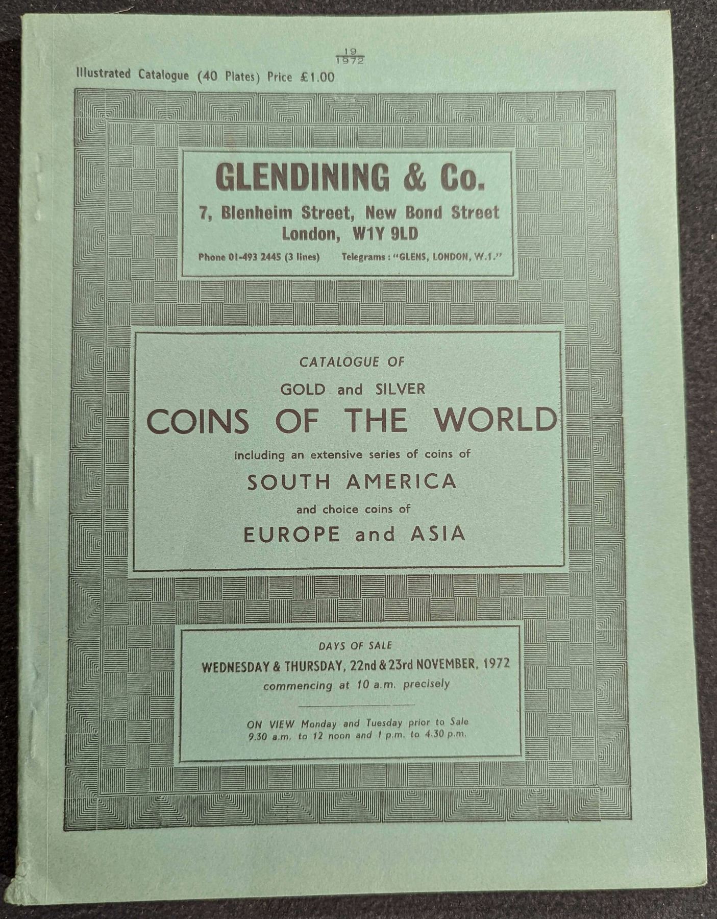 Glendining & Co. CATALOGUE OF GOLD AND SILVER COINS OF THE WORLD INCLUDING AN EXTENSIVE SERIES OF COINS OF SOUTH AMERICA AND CHOICE COINS OF EUROPE AND ASIA. November 22-23, 1972. 1-1054 lots. This auction sale catalog includes numismatic material from Latin America, Europe, Asia, and other foreign countries. Of particular interest are the ten 18th Century gold bullion bars from Mexico City. The strongest sections of the sale are the various groups of coins of South America, beginning with a collection of gold coins of Chile. In all there are 300 lots of gold coins from the Americas. The silver coins of the Americas are almost as extensive as they include several major rarities and also one of the most comprehensive selections of silver cobs of the mint of Potosi to appear. Another point of interest is a small but interesting group of Latin American medals and decorations. The gold and silver coins of Europe and Asia are of above average quality and the collection of Russian coins is comparable to the Michele Baranowsky Collection. London. Illustrated and Priced catalogs. original green printed card covers. Fine. Crown 4to. (6) 80 pages. 40 plates. Lot weight: 1 lbs 0oz. Subject(s): Latin American, European, Asian, World Coinage.