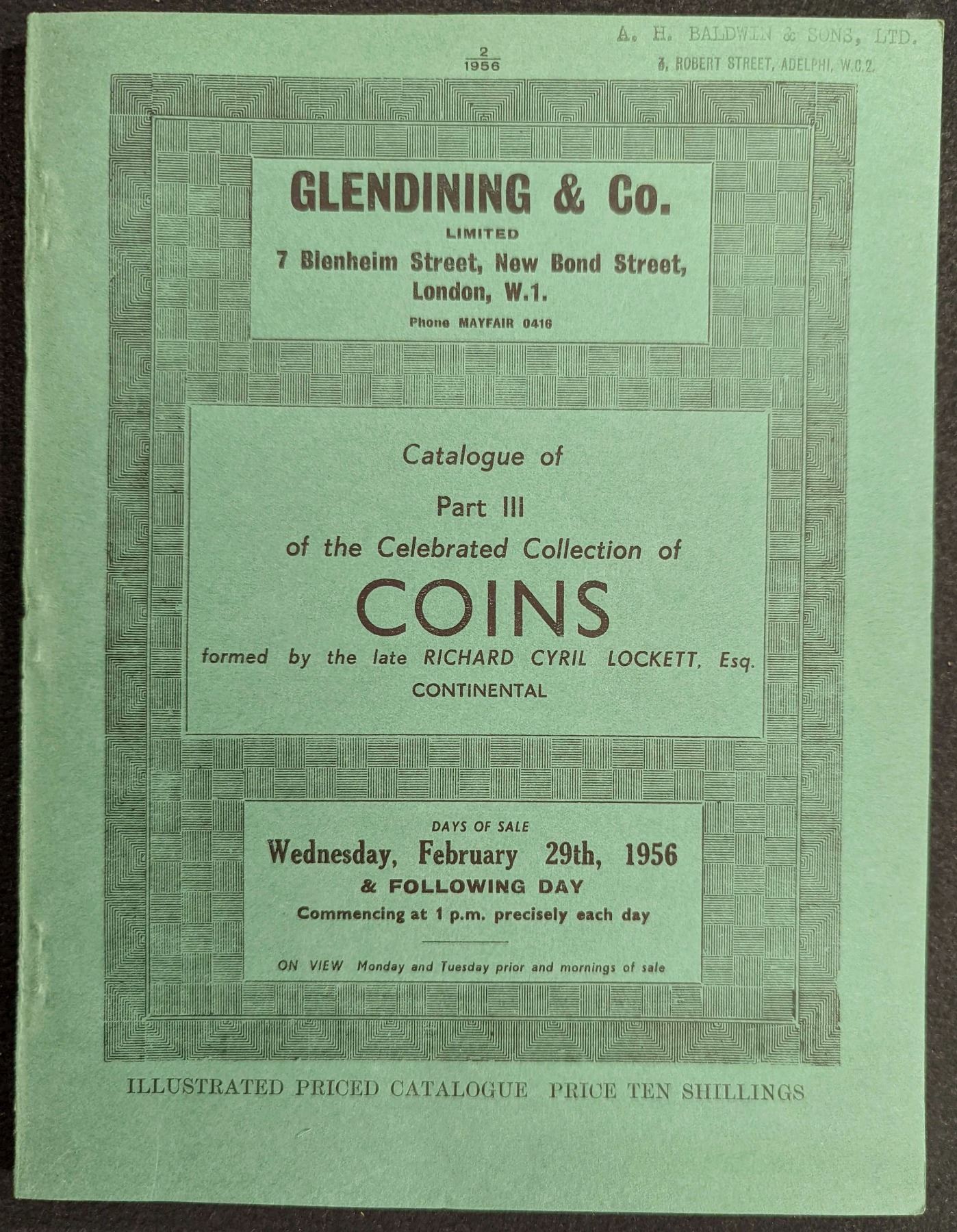 (2) Glendining & Co. Catalogue of Part III of the Celebrated Collection of Coins Formed by the Late Cyrill Lockett, Esq. Continental. February 29, 1956. Illustrated Priced Catalog. 1-710 lots. 84 pages. London. Original green printed card covers. crown 4to. 18 plates. Fine.
