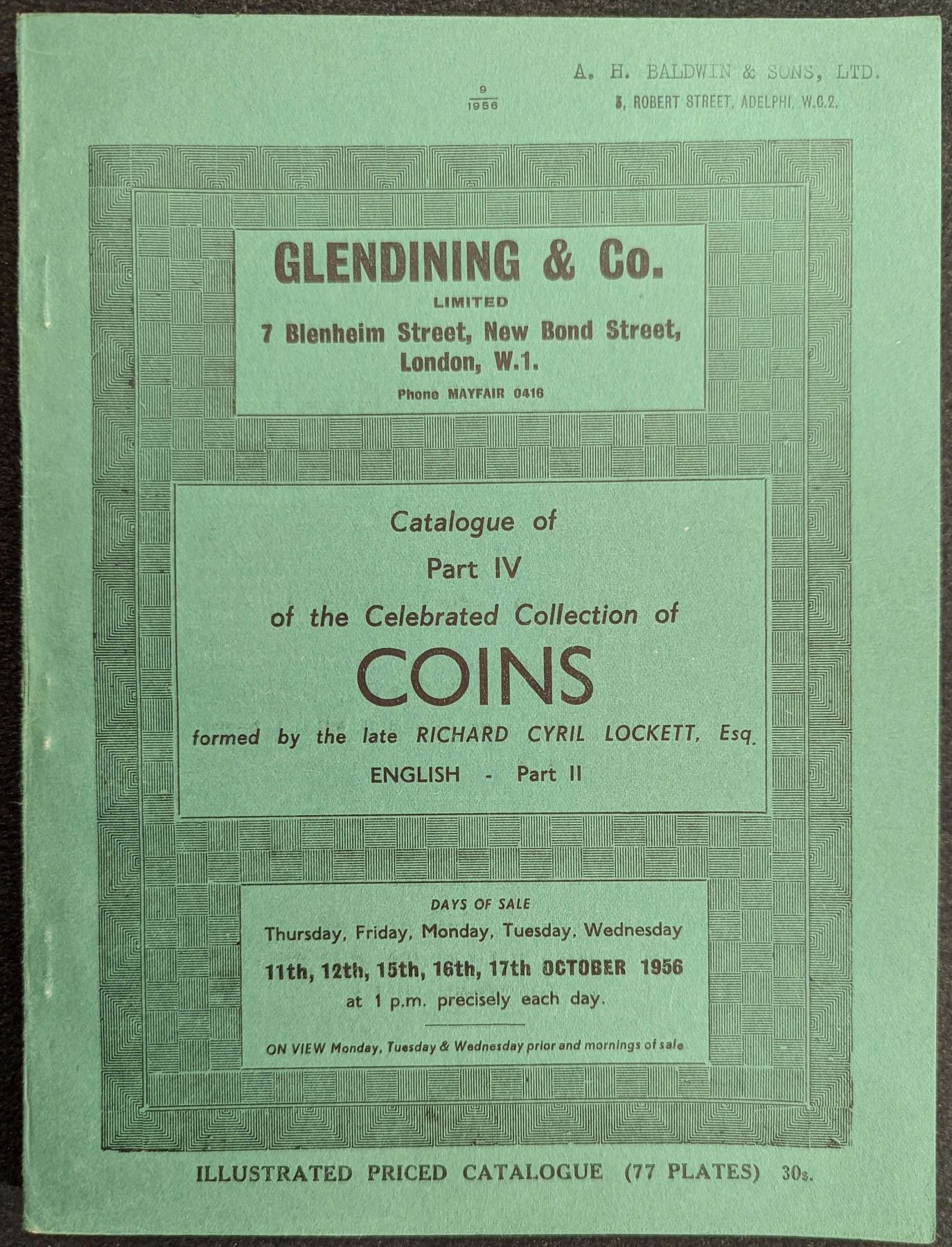 (3) Glendining & Co. Catalogue of Part IV of the Celebrated Collection of Coins Formed by the Late Cyrill Lockett, Esq. English Part II. October 11-12, 15-17, 1956. Illustrated Priced Catalog. 1223-2627 lots. 168 (2) pages. London. Original green printed card covers. crown 4to. 77 plates. Fine.