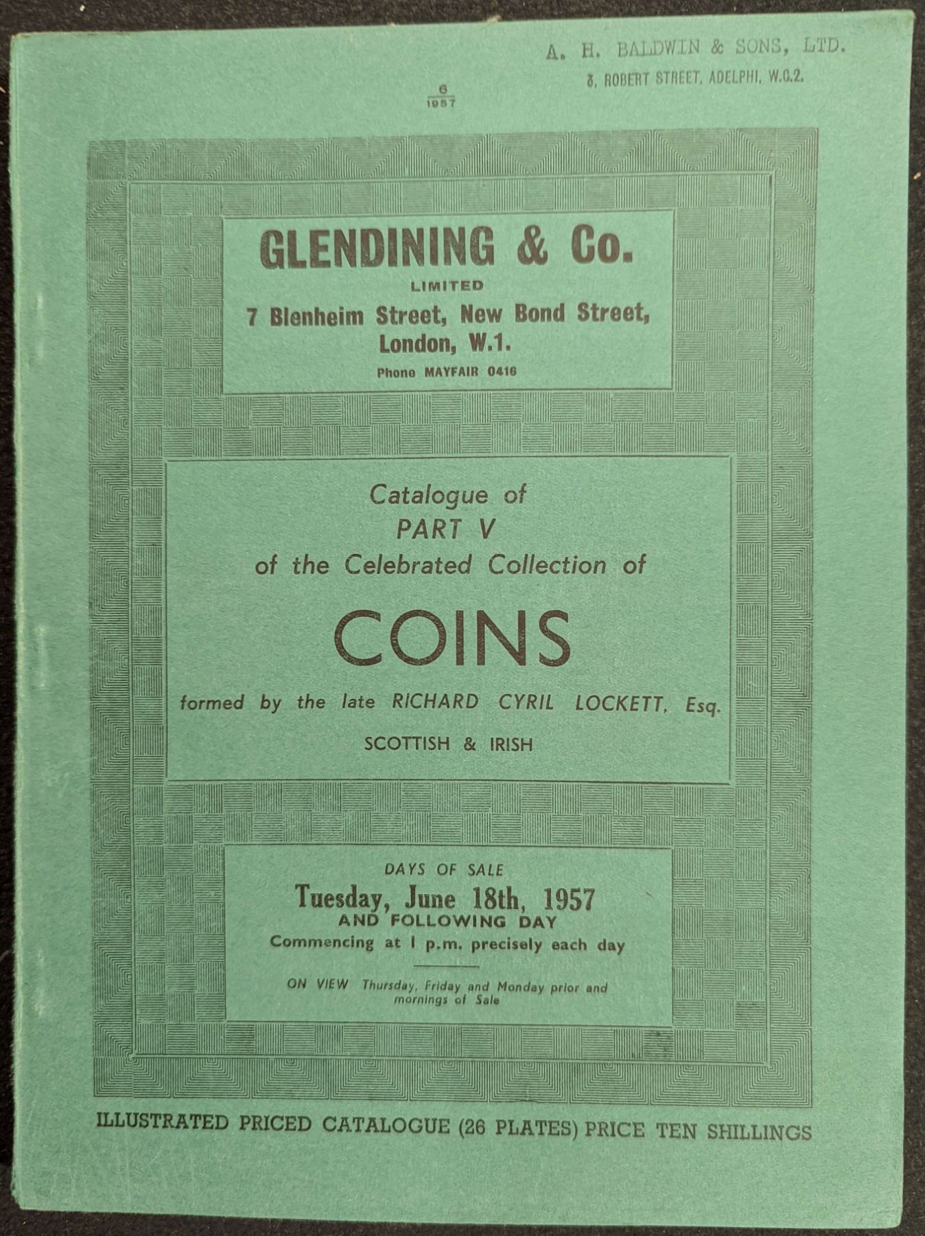 (4) Glendining & Co. Catalogue of Part V of the Celebrated Collection of Coins Formed by the Late Cyrill Lockett, Esq. Scottish and Irish. June 18, 1957. Illustrated Priced Catalog. 1-678 lots. 83 (1) pages. London. Original green printed card covers. crown 4to. 26 plates. Fine.