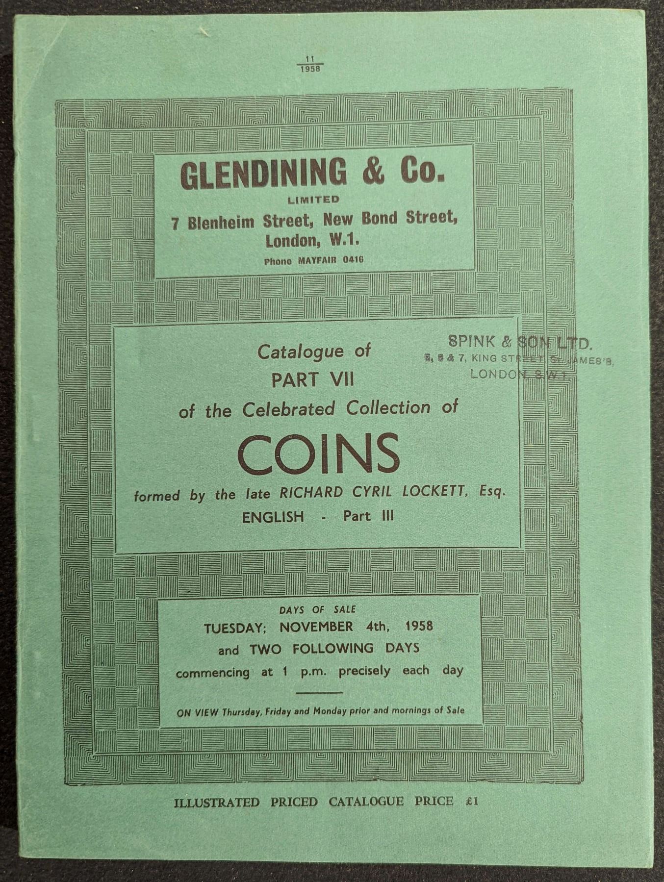 (5) Glendining & Co. Catalogue of Part VII of the Celebrated Collection of Coins Formed by the Late Cyrill Lockett, Esq. English Part III. November 4, 1958. Illustrated Priced Catalog. 2628-3545 lots. 112 (2) pages. London. Original green printed card covers. crown 4to. 39 plates. Fine.