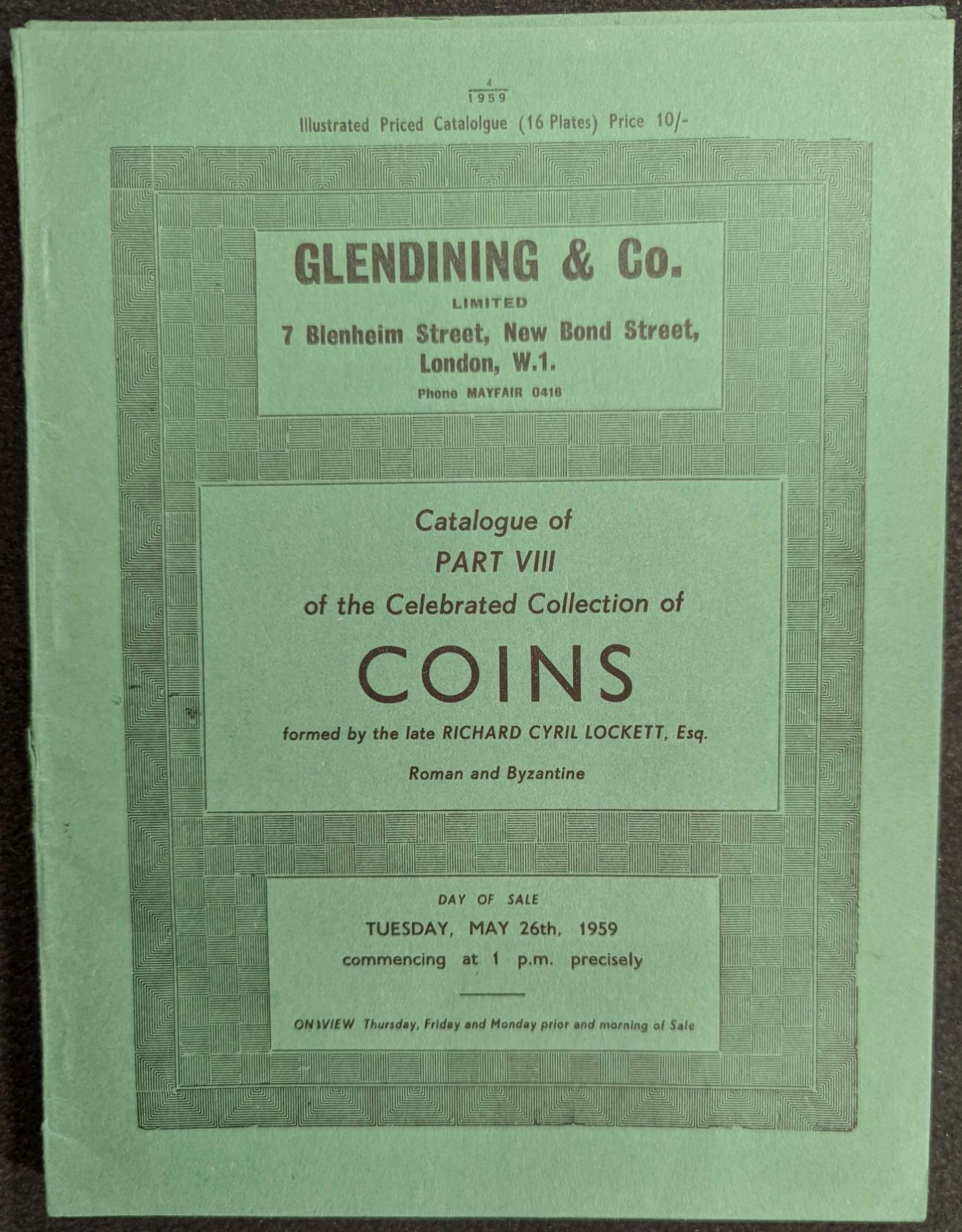 (6) Glendining & Co. Catalogue of Part VIII of the Celebrated Collection of Coins Formed by the Late Cyrill Lockett, Esq. Roman and Byzantine. May 26, 1959. Illustrated Priced Catalog. 1-299 lots. 38 (2) pages. London. Original green printed card covers. crown 4to. 16 plates. Fine.