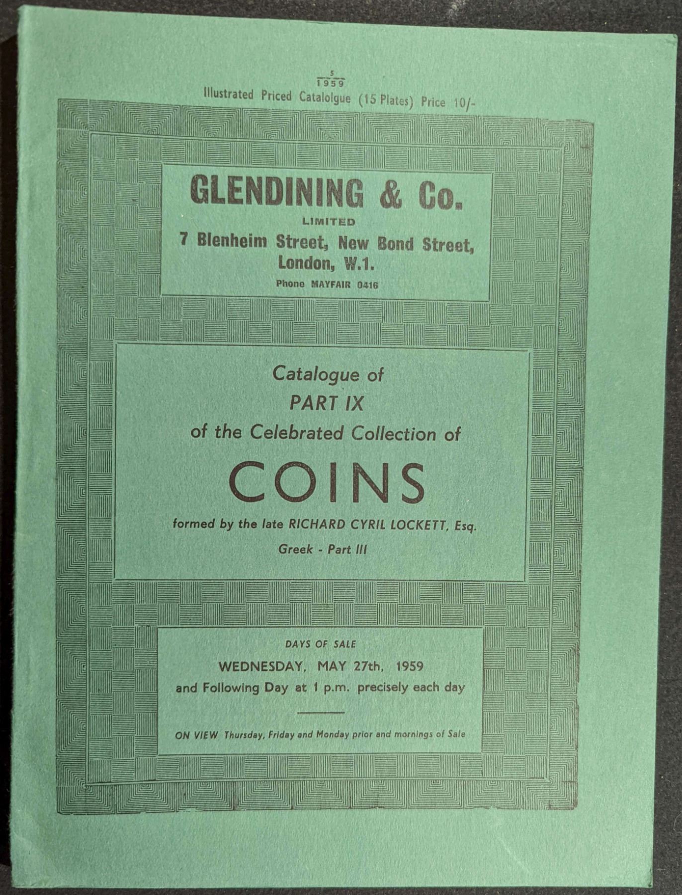 (7) Glendining & Co. Catalogue of Part IX of the Celebrated Collection of Coins Formed by the Late Cyrill Lockett, Esq. Greek - Part III. May 27, 1959. Illustrated Priced Catalog. 1553-2118 lots. 67 (1) pages. London. Original green printed card covers. crown 4to. 15 plates. Fine.