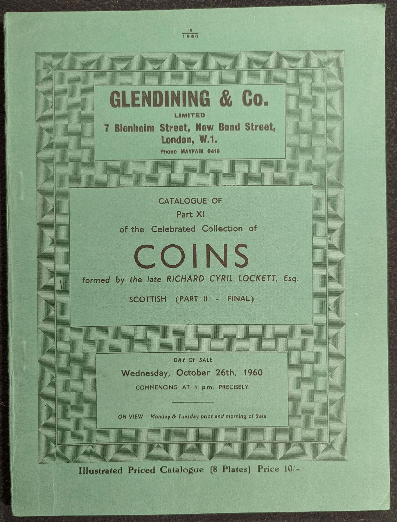 (9) Glendining & Co. Catalogue of Part XI of the Celebrated Collection of Coins Formed by the Late Cyrill Lockett, Esq. Scottish (Part II - Final). October 26, 1960. Illustrated Priced Catalog. 3546-4249 lots. 35 (1) pages. London. Original green printed card covers. crown 4to. 8 plates. Fine.
