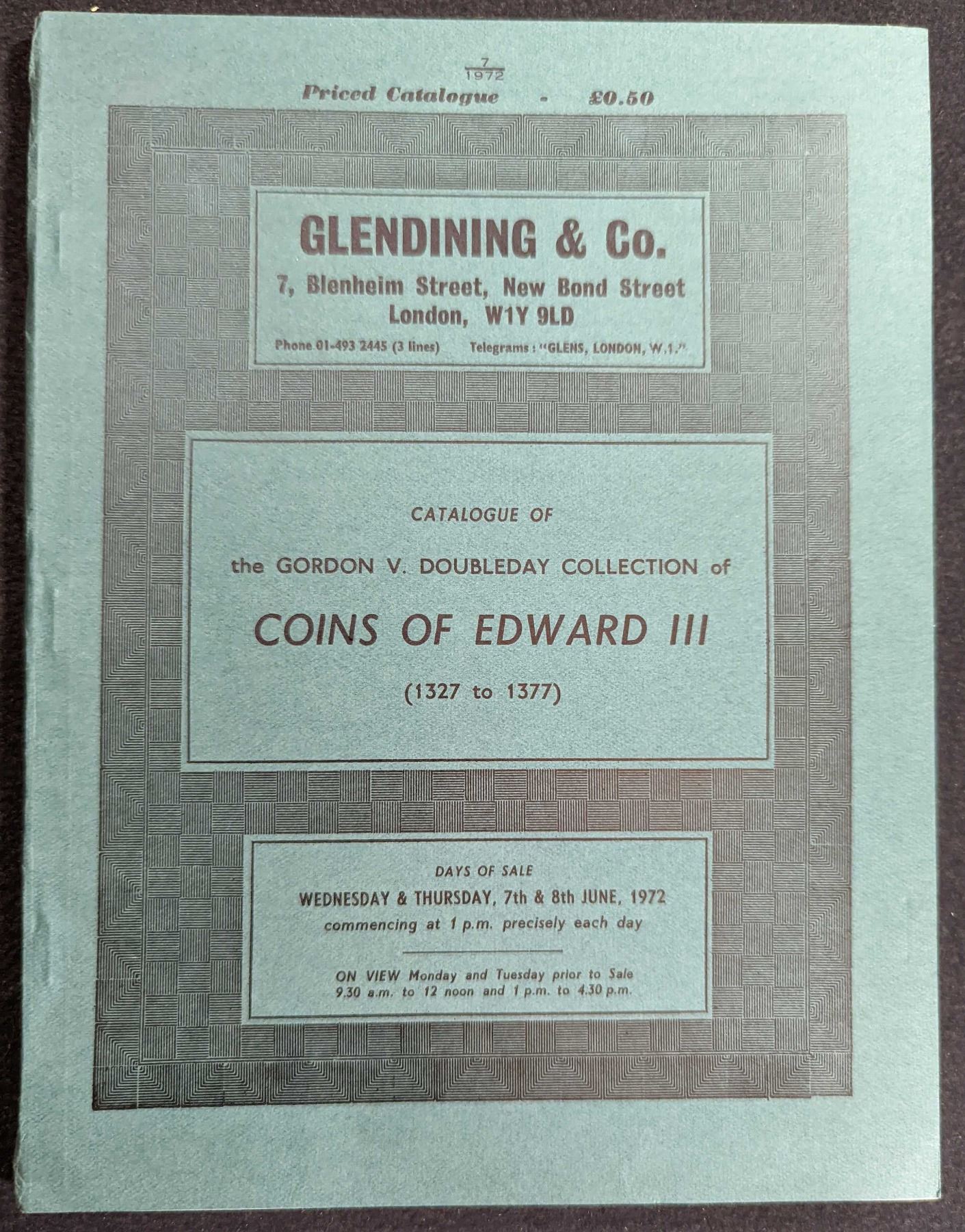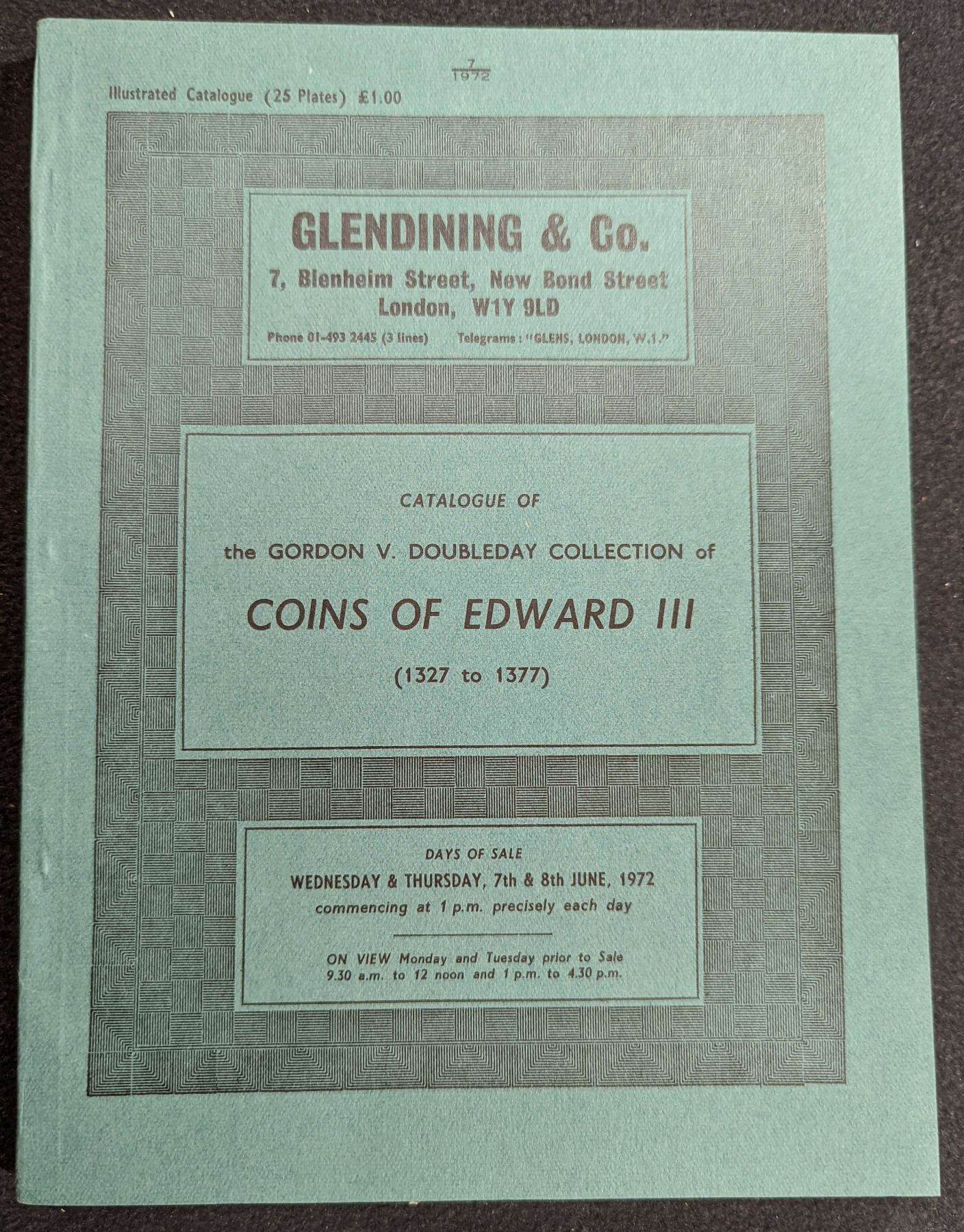 Glendining & Co. CATALOGUE OF THE GORDON V. DOUBLEDAY COLLECTION OF COINS OF EDWARD III (1327 TO 1377). June 7?8, 1972. 1-673 lots. This auction sale catalog includes numismatic material from Great Britain during the reign of Edward III as collected by Gordon V. Doubleday. A highly important collection of English hammered gold coins. London. Illustrated and Priced catalogs. original green printed card covers. Fine. Crown 4to. (4) 78 (2) pages. 25 plates. Lot weight: 1 lbs 1oz. Subject(s): Great Britain Coinage.