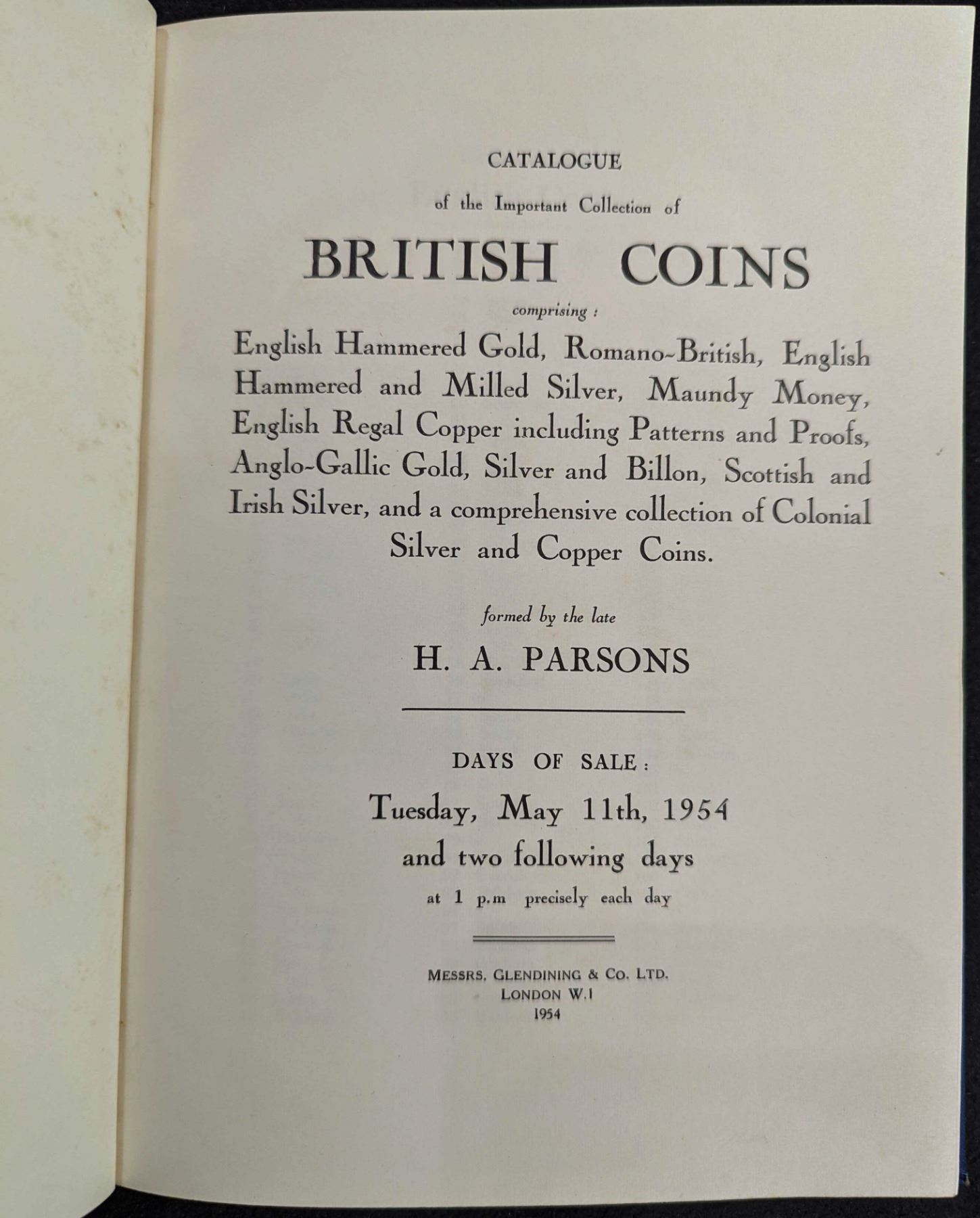 Glendining & Co. CATALOGUE OF THE IMPORTANT COLLECTION OF BRITISH COINS FORMED BY THE LATE H.A. PARSONS. May 11, 1954. 1-1060 Lots. Crown 8vo. This auction sale catalog includes an exceptional offering of numismatic material from Great Britain and its colonies as formed by H.A. Parsons. London. later blue cloth, gilt. 113, (1) pages. 23 fine plates. Fine. Lot weight: 1 lbs 1oz. Subject(s): British, West Indies Coinage.