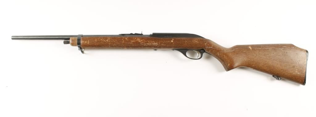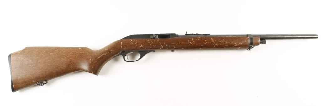 Semi automatic tube magazine rifle. Wood stocked with blued barrel, barrel band and bolt and an anodized alloy receiver and trigger guard. Rear sight adjustable for elevation. No front sight. Receiver is milled to accept weaver scope bases. Has sling swivels. Monte Carlo stock with a plastic butt plate. Wood stock has many shallow scratches, scrapes, dings and dents in the finish. The receiver and trigger guard show a few rubs and scratches in the finish with edge wear. The barrel has a few areas of surface rust. Butt plate has a few chips and rubs. Bright bore and good action. Condition: Fair
