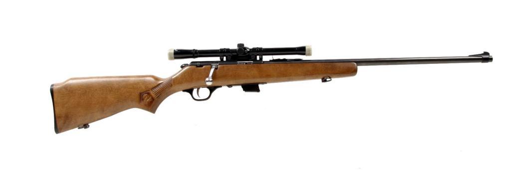 Glenfield Mdl 25 Cal .22S,L,LR SN:69317396 Bolt action box magazine hunting rifle. Blued finish, wood semi-pistol grip stock, 22" barrel with adjustable open sight and Glen Field 4x15 scope mounted in the scope groves on top of the receiver. Good bore anBolt action box magazine hunting rifle. Blued finish, wood semi-pistol grip stock, 22" barrel with adjustable open sight and Glen Field 4x15 scope mounted in the scope groves on top of the receiver. Good bore and action. Includes 1magazine. Condition: Very good but has been used.