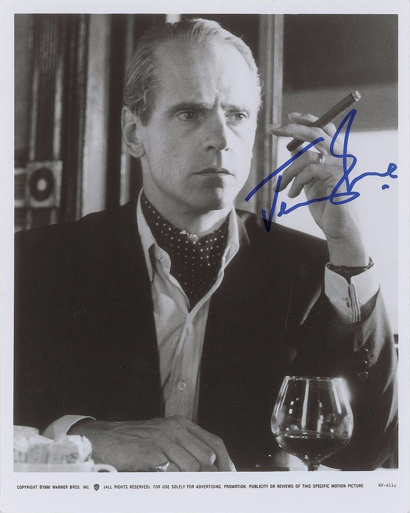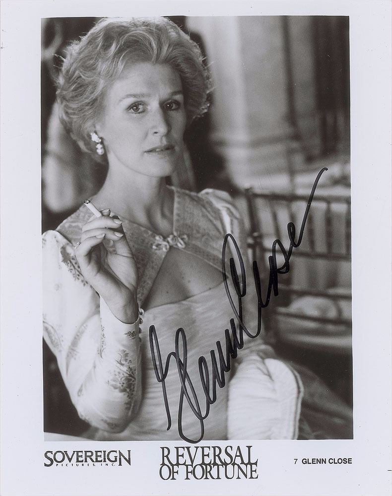 Pair of glossy 8 x 10 publicity photos for the 1990 film Reversal of Fortune: one depicts Jeremy Irons as Claus von Bulow, signed in blue felt tip; and other shows Glenn Close as Sunny von Bulow, signed in black felt tip. In overall very fine condition. Irons won the Oscar for Best Actor at the 63rd Academy Awards for his performance in the film. From the Harvey and Rhoda Kuflik Collection.