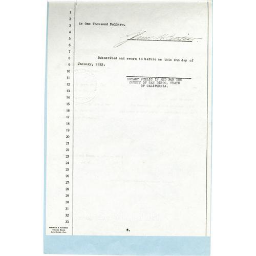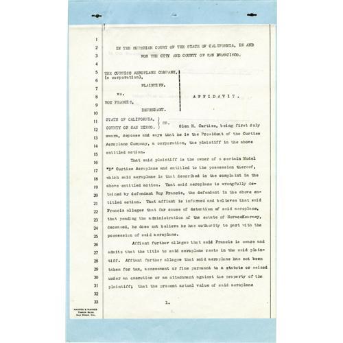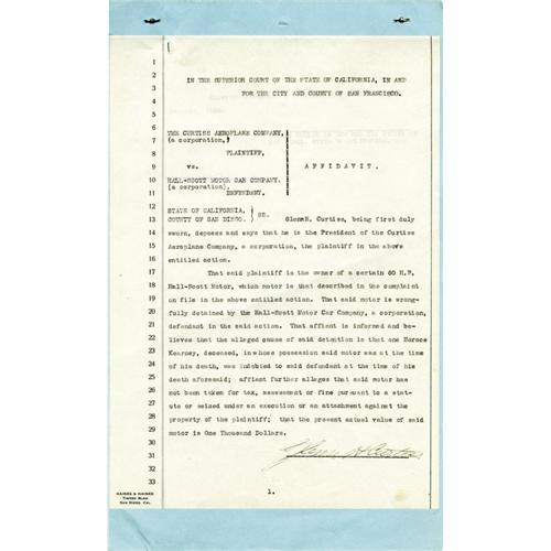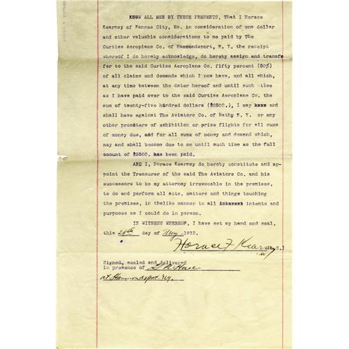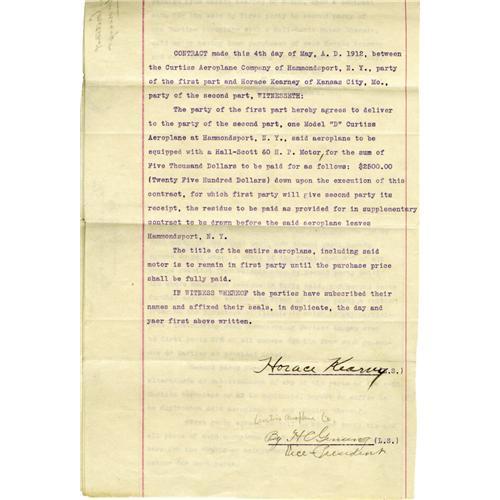<B>Horace Kearney purchases a Curtiss Aeroplane in 1912, seven months before he dies in the first attempt to fly over the ocean.</B></I><BR><BR><B>Glenn Curtiss/Horace Kearney Archive.</B></I> On May 4, 1912, aviator Horace Kearney purchased a Model "D" Curtiss Aeroplane, equipped with a Hall-Scott 60 horsepower motor, from the Curtiss Aeroplane Company for $5,000. He had been flying for about a year. Kearney paid $2,500 and agreed to pay Curtiss Aeroplane Company 50% of all moneys received by him from flights made in the plane until the balance of $2,500 was paid off. He flew at air meets in Los Angeles and Oakland, many times with airmail aboard, and, in a 105 day tour through the midwest, he flew every day, with only one minor accident due to engine failure. In September, 1912, he was the pilot for the airmail flights during the Illinois Aviation Meet and Street Circus. On December 14, 1912, 26-year-old Horace Kearney took off from Los Angeles, piloting a hydro-aeroplane called "Snookums" (his pet name for his fiancee). He was headed for San Francisco in the first attempted "over-ocean" flight. Also aboard was Los Angeles newspaperman Chester Lawrence. Soon after takeoff, the plane vanished in the mist off Point Fermin. Parts of the plane, including a pontoon and a wing tip, were found at Fishermans' cove, south of Redondo Beach, on December 17th. The bodies of Kearney and Lawrence were found off the California coast near Rocky Point on December 19th. Almost exactly nine years after the Wright Brothers had made man's first successful airplane flight (December 17, 1903), Horace Kearney became the first aviator to be lost at sea. The Archive of letters and documents comprises:<BR><BR>(1) Typed Contract Signed: "<I>Horace Kearney</B></I>" and "<I>By H C Genung"</B></I> as Vice President of Curtiss Aeroplane Company, one page, 8" x 13". Hammondsport, New York, May 4, 1912. In part: "<I>The party of thefirst part hereby agrees to deliver to the party of the second part, one Model 'D' Curtiss Aeroplane at Hammondsport, N.Y., said aeroplane to be equipped with a Hall-Scott 60 H.P. Motor, for the sum of Five Thousand Dollars to be paid for as follows: $2500.00 (Twenty Five Hundred Dollars) down upon the execution of this contract, for which first party will give second party its receipt, the residue to be paid as provided for in supplementary contract to be drawn before the said aeroplane leaves Hammondsport, N.Y. The title of the entire aeroplane, including said motor is to remain in first party until the purchase price shall be fully paid....</B></I>" <BR><BR>(2) Typed Receipt Signed: "<I>G. H. Curtiss</B></I>" possibly by a secretary, one page, 8" x 6.5". Hammondsport, N.Y., May 4, 1912. In part: "<I>The Curtiss Aeroplane Co., hereby acknowledges the receipt from Horace Kearney of $2500....</B></I>"<BR><BR>(3) Typed Supplemental Contract Signed: "<I>H. C. Genung</B></I>" as Vice President and "<I>Horace F. Kearney</B></I>", witnessed by "<I>G. R. Hall</B></I>", 1.5 pages, 8" x 13". Hammondsport, N.Y., May 24, 1912. Hall was Secretary-Treasurer of the Curtiss Aeroplane Co. Kearney agrees, in part, "<I>to keep said aeroplane, at his own expense in as good repair as when delivered to him...agrees to pay over to party of the first part 50% of all moneys received from flights made by second party until the above mentioned residue is fully paid, and second party further agrees to execute in favor of first party a written order on the promoters of flights in which he may participate, instructing such promoters or parties to pay over to first party 50% of all moneys due him from such promoters or parties as provided herein....</B></I>"<BR><BR>(4) Typed Assignment with Power of Attorney Signed: "<I>Horace F. Kearney</B></I>", witnessed by "<I>G R Hall</B></I>", one page, 8" x 13". Hammondsport, N.Y., May 24, 1912. In part: "<I>I Horace Kearney of Kansas City, Mo. in consideration of one dollar and other valuable consideration to me paid by The Curtiss Aeroplane Co. of Hammondsport, N.Y., the receipt whereof I do hereby acknowledge, do hereby assign and transfer to the said Curtiss Aeroplane Co. fifty percent (50%) of all claims and demands which I now have, and all which, at any time between the date hereof and until such time as I have paid over to the said Curtiss Aeroplane Co. the sum of twenty-five hundred dollars ($2500.), I may and shall have against The Aviators Co. of Bath, N.Y. or any other promoters of exhibition or prize flights for all sums of money due, and for all sums of money and demand which, may and shall become due to me until such time as the full amount of $2500. has been paid....</B></I>"<BR><BR>(5) Typed Document Signed: "<I>Martha Genung</B></I>" as Notary Public, one page, 8" x 13". Hammondsport, N.Y., December 17, 1912. In full: "<I>On this 17th day of December A.D. 1912, before me personally appeared H. C. Genung of Hammondsport, N.Y., who being duly sworn deposes and says: I reside in Hammondsport, N.Y. and was a Director and Vice-President of The Curtiss Aeroplane Co. at the time attached papers were executed by Horace Kearney, and I have at all times since the execution of attached papers been a Director and Vice-President of The Curtiss Aeroplane Co. and I hereby certify that the papers attached hereto are originals.</B></I>" <BR><BR><B>The autograph of pioneer aviator Horace Kearney is extremely rare and virtually unobtainable in any form.</B></I> All five documents are attached together by two circular metallic fasteners punched in the upper blank margins. The December 17, 1912, notarized statement is first. It is interesting to note that on December 17, 1912, parts of Kearney's plane had been found but it wasn't until December 19th that Kearney's body was found.<BR><BR>Accompanied by two affidavits "<I>In the Superior Court of the State of California, in and for the City of San Francisco,</B></I>" January 6, 1913:<BR><BR>(1) Carbon Typed Document Signed: "<I>Glenn 