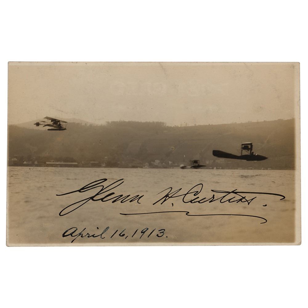 Vintage pearl-finish 5.25 x 3.25 postcard photo of a Curtiss Flying Fish soaring over a lake, signed in bold black ink, "Glenn H. Curtiss, April 16, 1913." In fine condition, with trimmed borders, and some light scuffing and silvering.