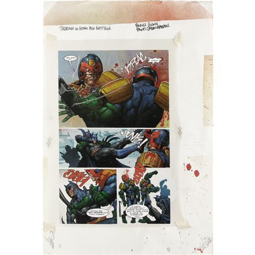 <B>Glenn Fabry and Jason Brashill - The Batman/Judge Dredd Files, page 44 Original Art (DC, 1998).</B></I> Mega-City One's toughest lawman collides with Gotham City's Dark Knight in this explosive page penciled by Glenn Fabry, and painted by Jason Brashill. From the story, "Die Laughing," which was written by John Wagner and Alan Grant, this page was hand painted on illustration paper, and has an image area of 10" x 15". The word balloons are on an acetate overlay. In Excellent condition.