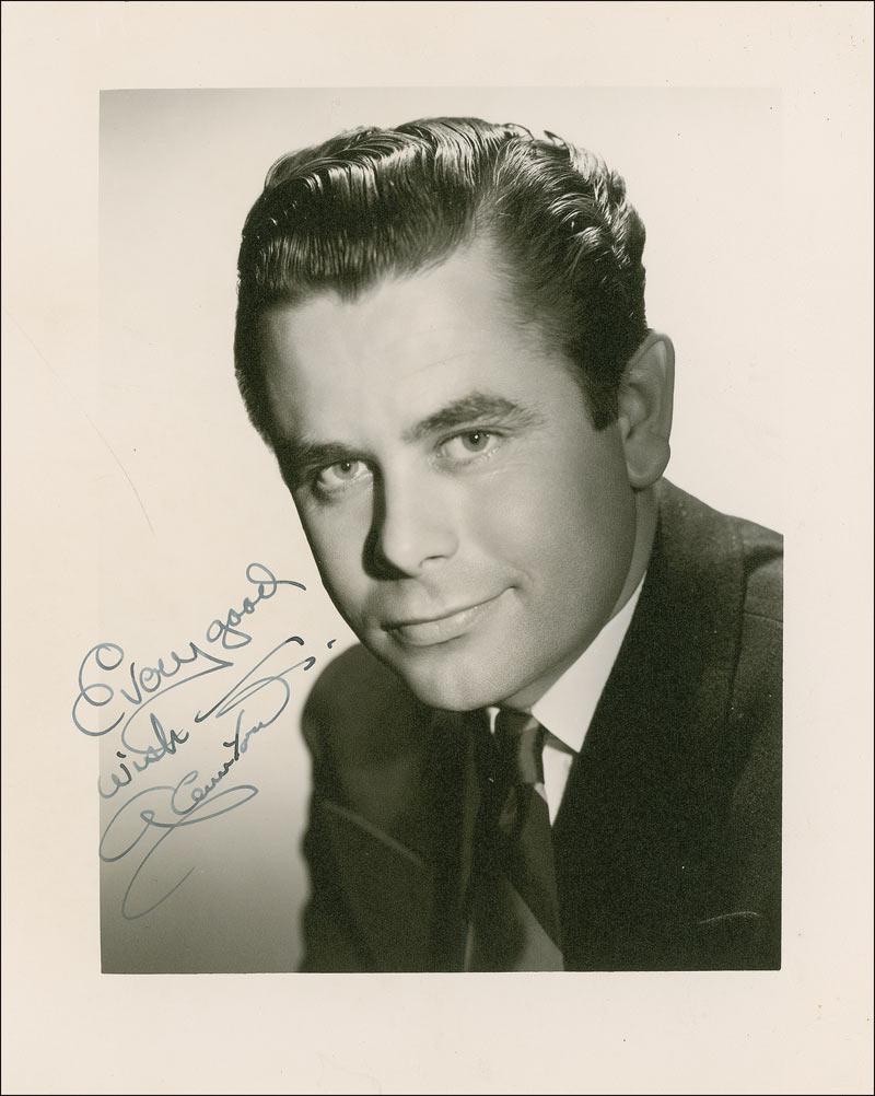 Vintage matte-finish 8 x 10 photo of Ford in a suit and tie, signed in ink “Every good wish—Glenn Ford.” In fine condition, with a paperclip impression at the top border.