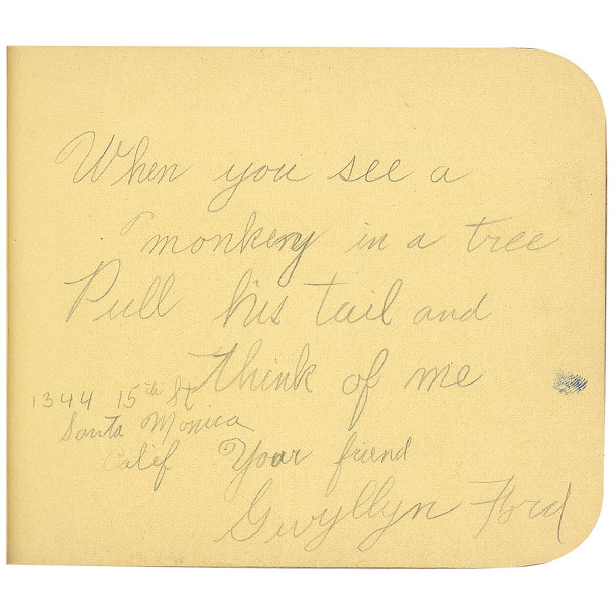 Vintage school-age pencil signature, “When you see a monkey in a tree, Pull his tale and think of me. Your friend, Gwyllyn Ford,” “1344 15th St, Santa Monica, Calif.,” on a light yellow 5.25 x 4.5 album page. Signature is still housed in its original autograph album, with many other signatures of the owner’s classmates, some dated 1928. In fine condition, with expected wear to album. Ford would change his name in 1939 upon joining Columbia Pictures, taking his name from his father's hometown of Glenford, Canada.