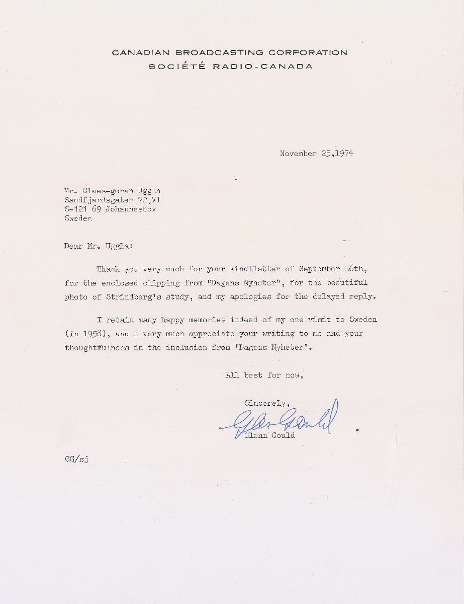 Canadian pianist, composer, and commentator (1932–1982) revered as one of the foremost classical pianists of the 20th century, and renowned for his interpretations of the keyboard music of Johann Sebastian Bach. TLS, one page, 8.5 x 11, Canadian Broadcasting Corporation letterhead, November 25, 1974. Letter to Mr. Claes-goran Uggla, in full: “Thank you very much for your kind letter of September 16th, for the enclosed clipping from ‘Dagens Nyheter,’ for the beautiful photo of Strindberg’s study, and my apologies for the delayed reply. I retain many happy memories indeed of my one visit to Sweden (in 1958), and I very much appreciate your writing to me and your thoughtfulness in the inclusion from ‘Dagens Nyheter.’” In fine condition. Accompanied by the original mailing envelope.