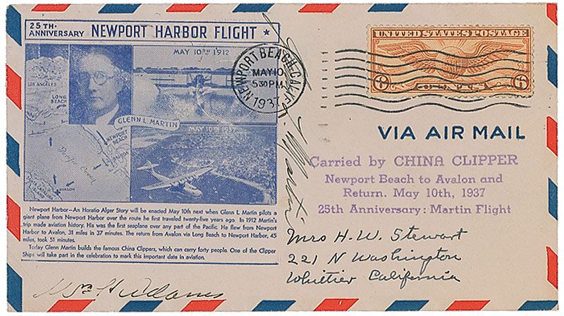Flown commemorative cover with a cachet honoring the 25th anniversary of Martin’s Newport Harbor flight, signed in black ink vertically along the cachet by Martin, “Glenn L. Martin.” In fine condition, with a handwritten address to lower right corner and an owner’s signature along bottom edge.