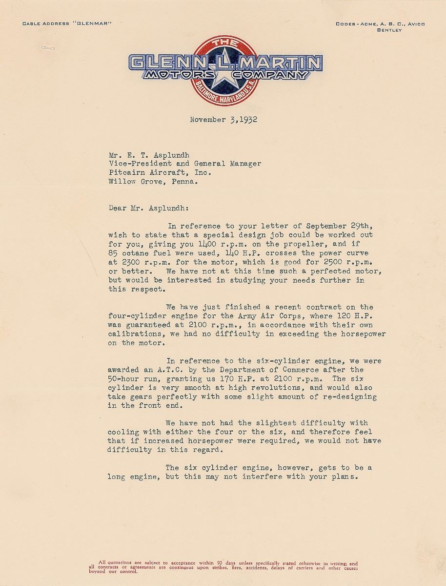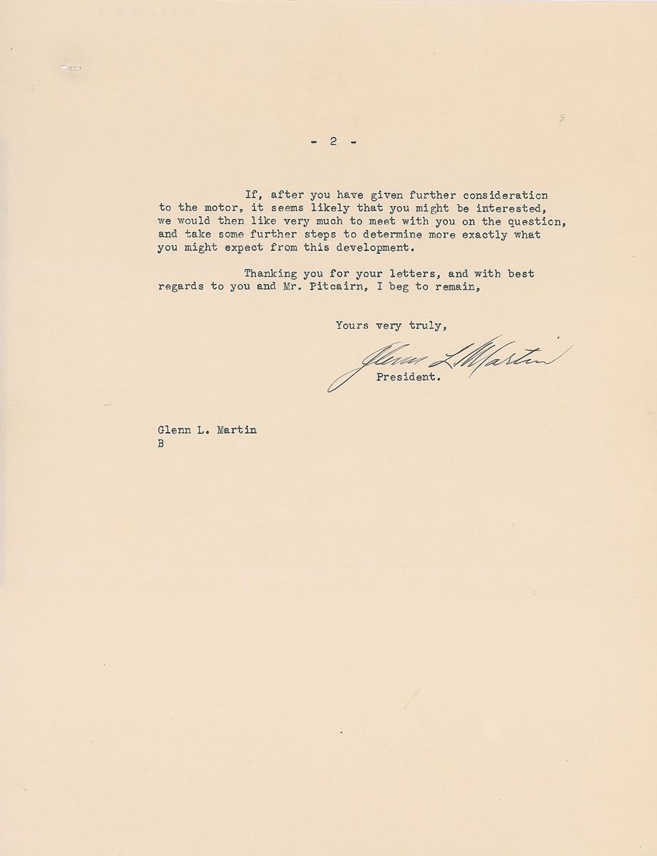 TLS signed “Glenn L. Martin,” two pages, 8.25 x 11, Glenn L. Martin Motors Company letterhead, November 3, 1932. Letter to E. T. Asplundh of Pitcairn Aircraft, in part: “A special design job could be worked out for you, giving you 1400 r.p.m. on the propeller, and if 85 octane fuel were used, 140 H.P. crosses the power curve at 2300 r.p.m…We have just finished a recent contract on the four-cylinder engine for the Army Air Corps, where 120 H.P. was guaranteed at 2100 r.p.m…we had no difficulty in exceeding the horsepower on the motor…The six-cylinder is very smooth at high revolutions, and would also take gears perfectly with some slight amount of re-designing in the front end…The six cylinder engine, however, gets to be a long engine, but this may not interfere with your plans.” In fine condition, with staple holes to the upper left corner.