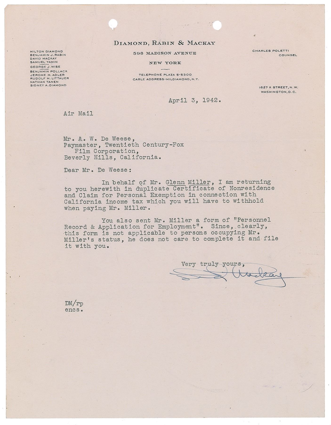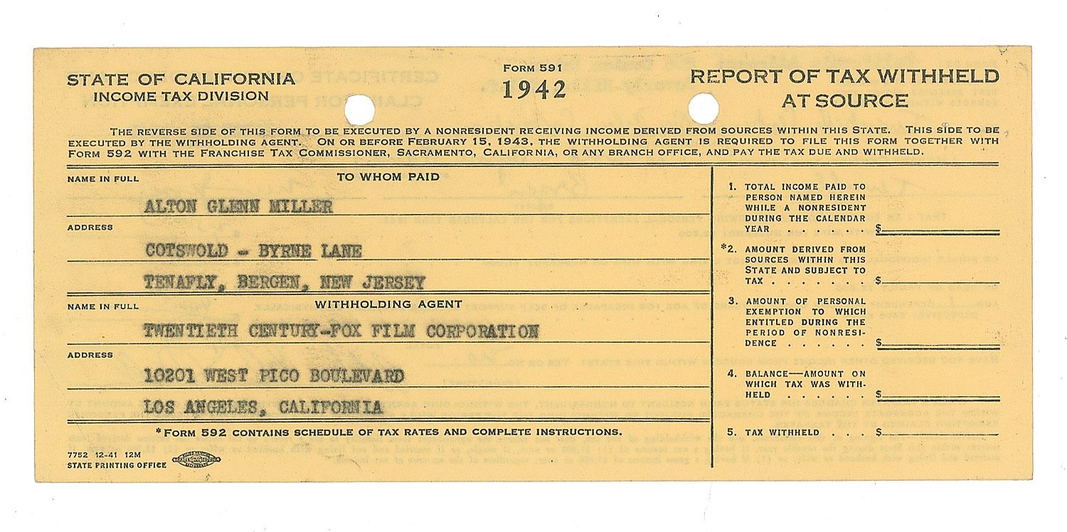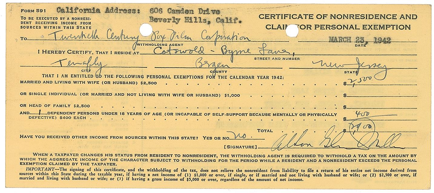 One-of-a-kind DS, signed "Alton Glenn Miller," one page, 8 x 3.5, March 23, 1942. A "Certificate of Nonresidence and Claim for Personal Exemption," submitted to the Twentieth Century Fox Film Corporation, certifying that he resides in New Jersey and is therefore entitled to a personal exemption of $2,900. In fine condition, with light creasing. Accompanied by a TLS from Mr. A. W. De Weese, written on Miller's behalf, regarding the tax document. Certainly an unusual format, with an even more uncommon formal signature from Miller.