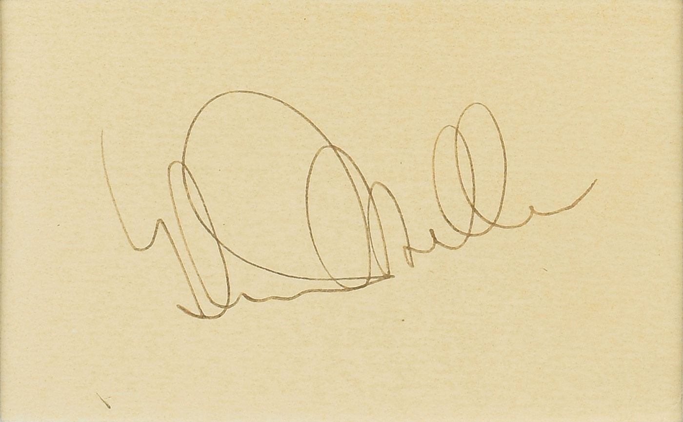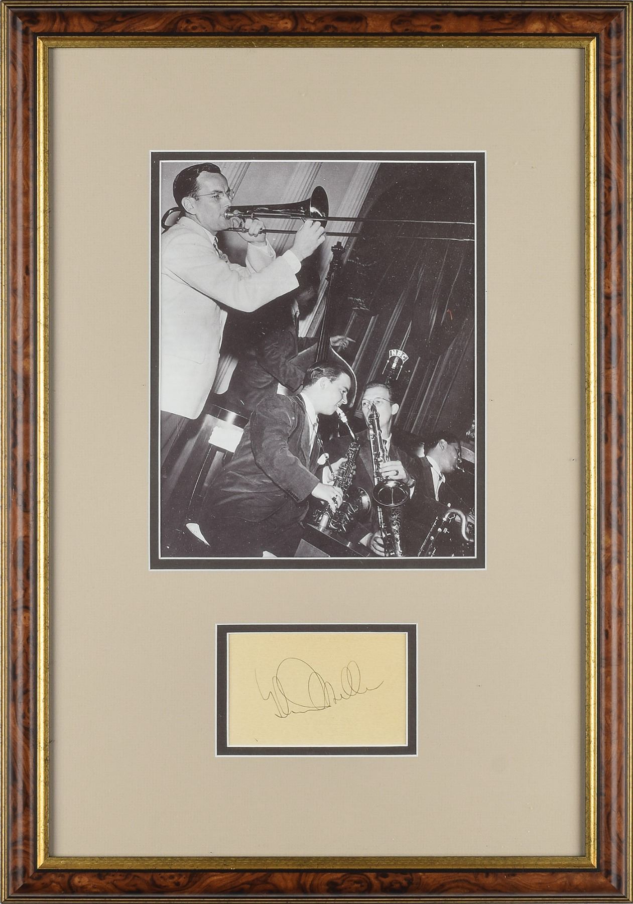 Vintage fountain pen signature, "Glenn Miller,” on an off-white 4.5 x 2.75 card. Nicely double-matted and framed with a portrait of the trombonist to an overall size of 16 x 23. In fine condition.