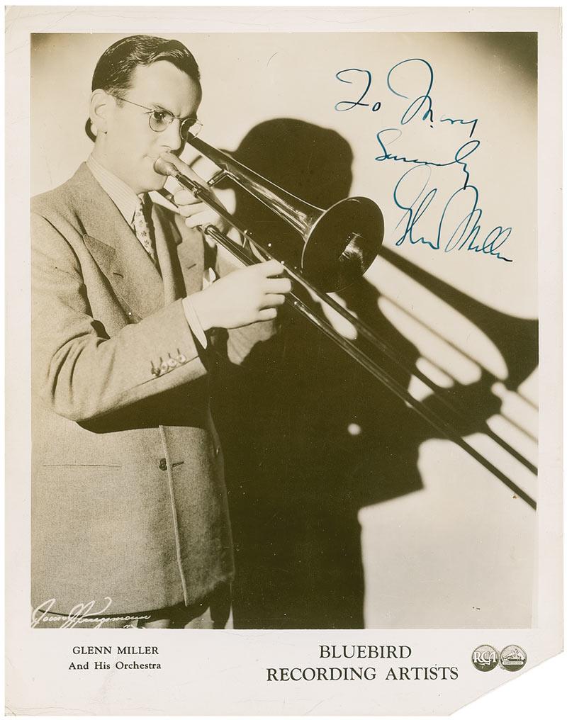 Popular big band leader (1904–1944). In 1942, Miller joined the U.S. Air Force and organized the Glenn Miller Army Air Force Band to entertain the troops. In December 1944, on a flight from England to Paris, the plane Miller was traveling in disappeared over the English Channel and was never found. Vintage 8 x 10 Bluebird/RCA promotional photo of Miller playing his trombone, signed and inscribed in fountain pen “To Mary, Sincerely, Glenn Miller.” In very good condition, with missing lower right corner, and scattered creases and surface marks, none affecting signature.