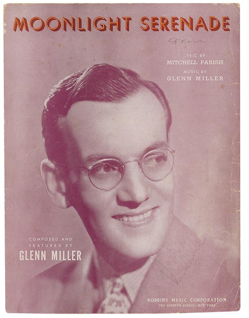 Vintage sheet music cover for ‘Moonlight Serenade,’ 9 x 12, signed in pencil in the lower right corner by Miller. In very good condition, with detached back cover, scattered creases, mainly to edges, some mild foxing, and Miller’s signature a bit light, but legible.