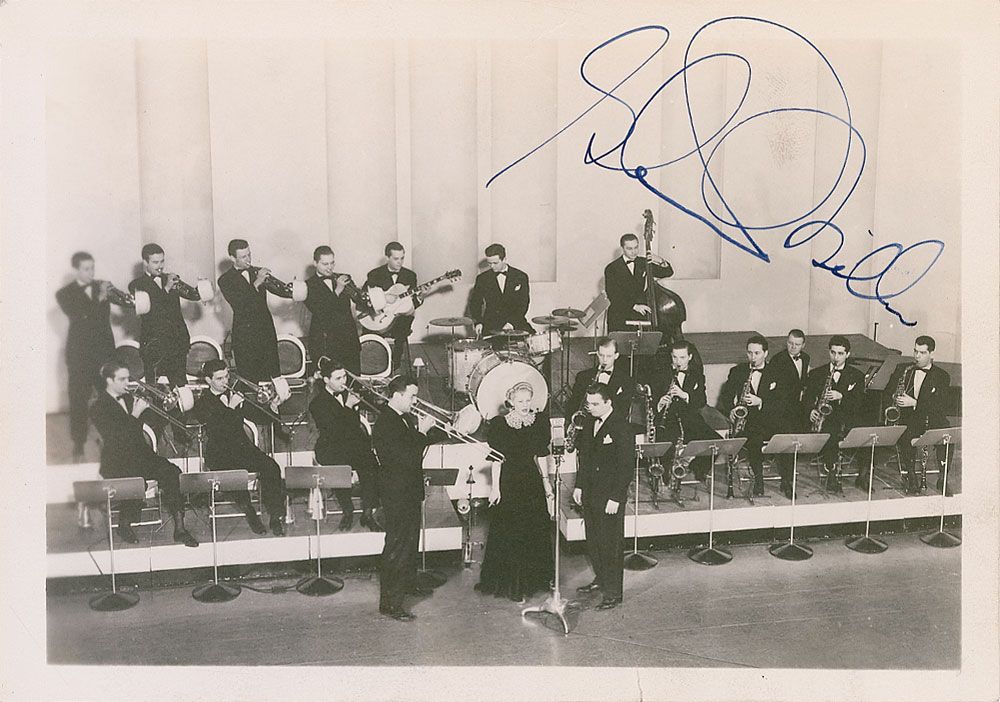 Popular big band leader (1904–1944). In 1942, Miller joined the US Air Force and organized the Glenn Miller Army Air Force Band to entertain the troops. In December 1944, on a flight from England to Paris, the plane Miller was traveling in disappeared over the English Channel and was never found. Vintage matte-finish 7 x 5 photo of Miller and his orchestra on stage, signed in fountain pen. In fine condition, with a couple of light creases and a small tear to bottom edge.