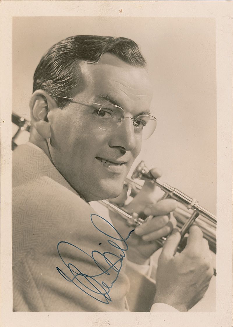 Vintage matte-finish 5 x 7 photo of Miller holding his trombone, signed in fountain pen. In fine condition, with a single tack hole to top border and a bit of trivial rippling to top edge.
