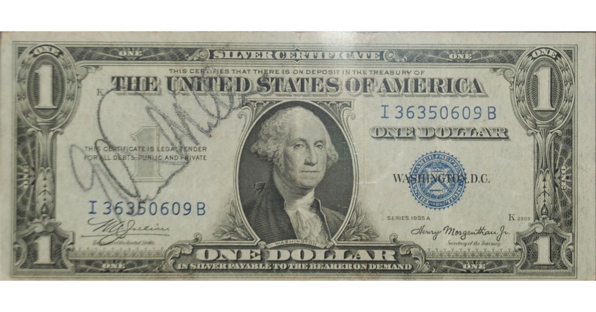 A $1 Silver certificate 1935 series, signed in bold graphite by Glenn Miller (March 1, 1904 – missing in action December 15, 1944) was an American big band musician, arranger, composer, and bandleader in the swing era. He was the best-selling recording artist from 1939 to 1943, leading one of the best known big bands.