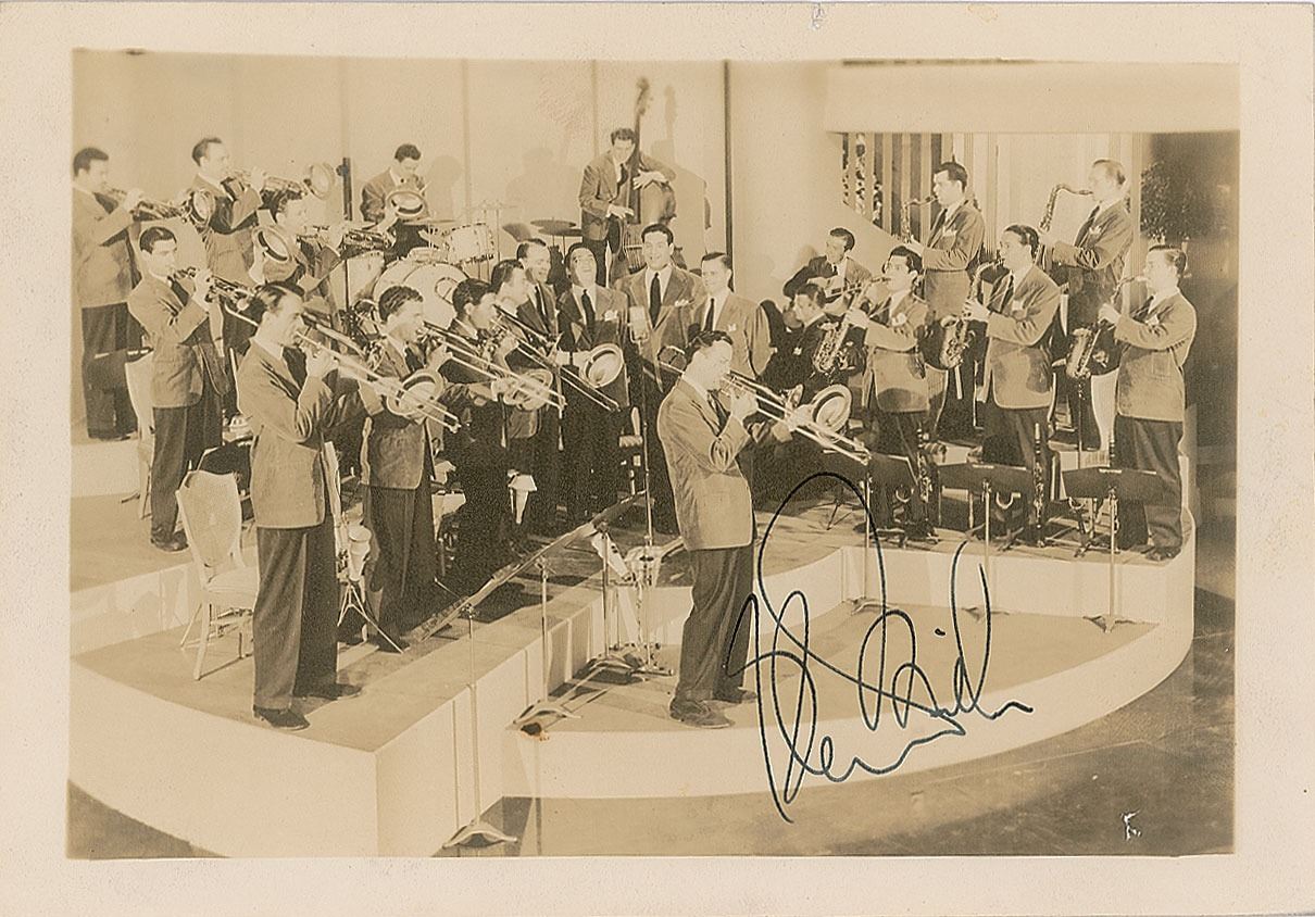 Vintage matte-finish 7 x 5 photo of Miller performing with his band, prominently signed in fountain pen. In fine condition.