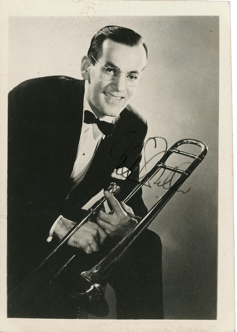 Vintage matte-finish 5 x 7 photo of Miller posing with his trombone, signed in fountain pen. In fine condition, with a bit of light signature contrast and some scattered light silvering to darker areas. RRAuction COA.