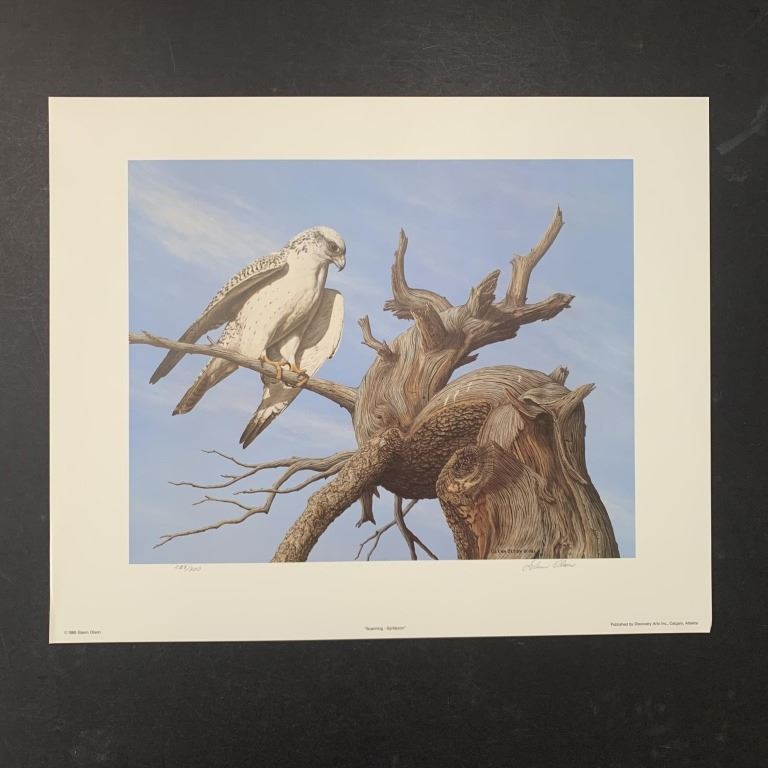 Glenn Olson's "Scanning - Gyrfalcon" limited edition print, signed lower right and numbered 288/300 lower left. This piece is of a gyrfalcon perched on a branch at the top of a tree. This piece is in excellent condition and comes with its original folder from the publisher, Discovery Arts Inc.