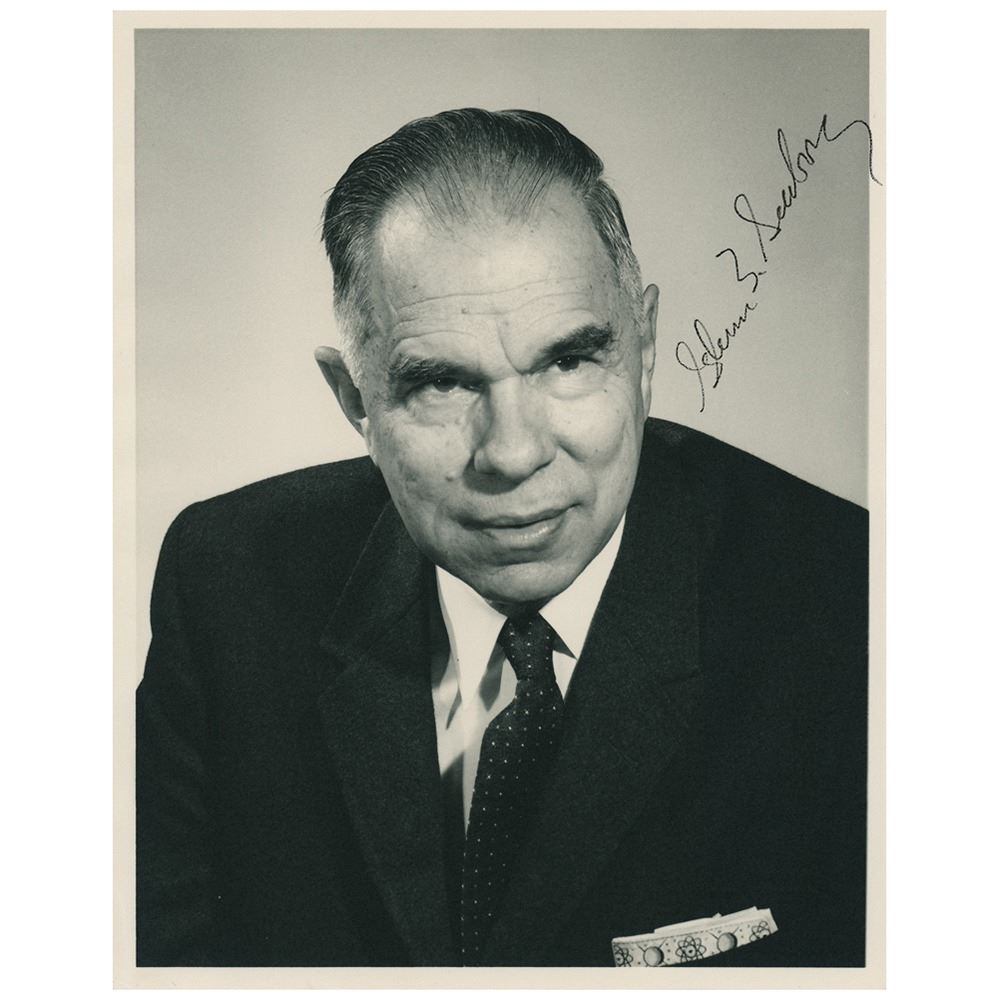 Nobel Prize-winning chemist (1912–1999) who was instrumental in the discovery of several elements, and developed the extraction process used to isolate the plutonium fuel for the second atomic bomb during the Manhattan Project. Matte-finish 8 x 10 photo of the scientist posing with a molecular-model handkerchief in his pocket, signed in black felt tip, "Glenn T. Seaborg." In very fine condition.