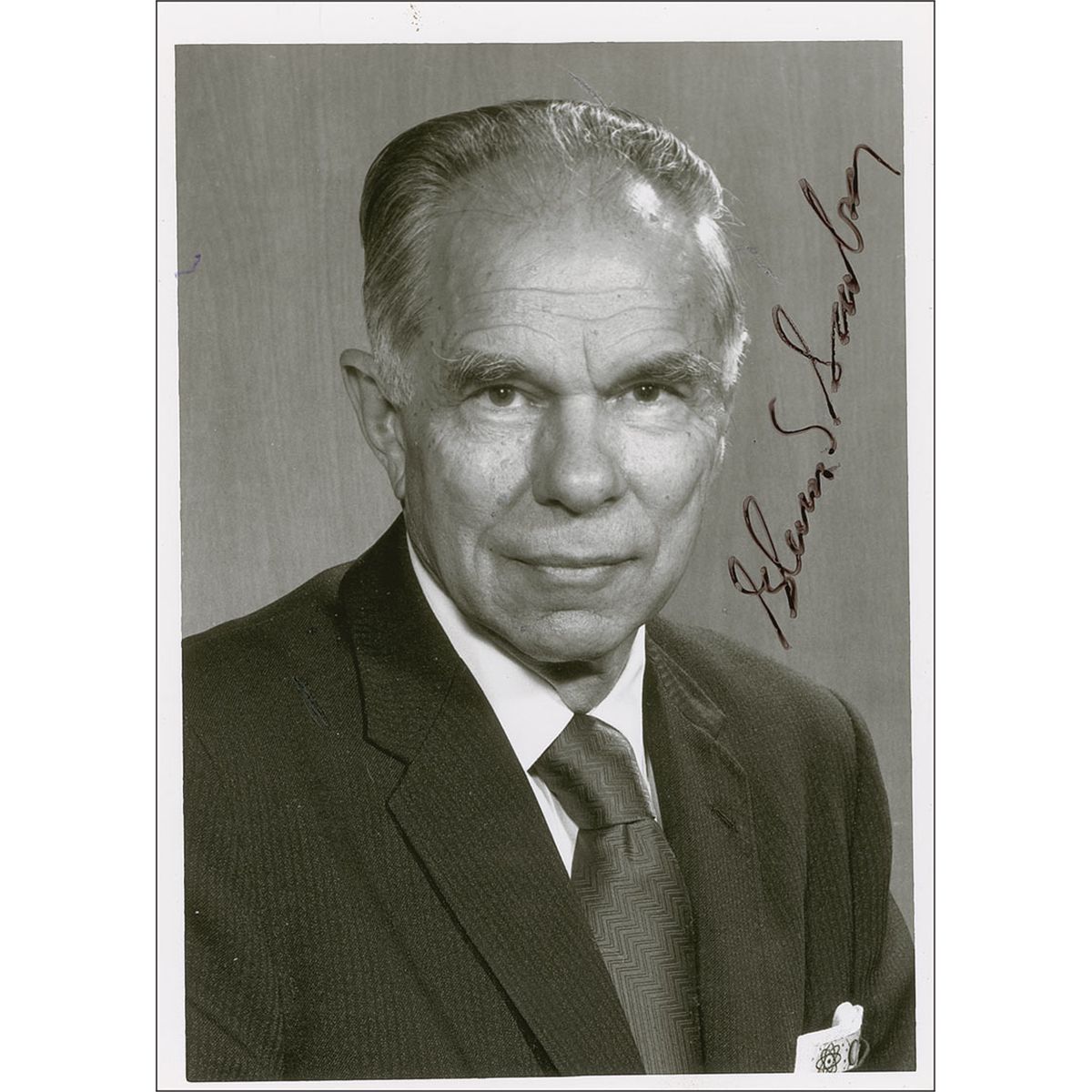 Glossy 5 x 7 head-and-shoulders photo, signed vertically in black felt tip, “Glenn Seaborg.” In fine condition, with slightly irregular ink adhesion to the signature.