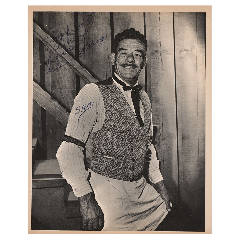 Vintage 8 x 10 paperstock photo of Strange in his classic role as Sam Noonan, the bartender on CBS's Gunsmoke television series, signed and inscribed in blue ballpoint, "To my friend 'Stanley,' Sincerely, Glenn Strange," who adds his character name below, "Sam.” In very fine condition, with faint edge toning.