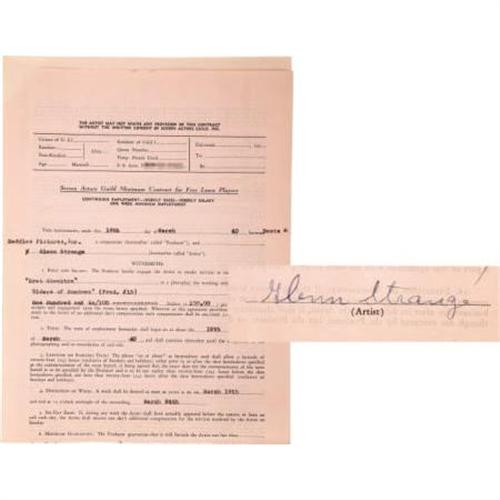 <B>Glenn Strange Signed</B></I> <B><I>Riders of Sundown</B></I></B></I> <B>Contract.</B></I> A Screen Actors Guild freelance contract dated March 19, 1940, engaging Strange for the role of "Bret Stockton" opposite Tex Ritter in the Western <I>Riders of Sundown</B></I> (released in 1940 as <I>Cowboys of Sundown</B></I>), signed by Strange on the back in blue ink. Glenn Strange, of course, later won major horror genre distinction as the Frankenstein Monster in <I>House of Frankenstein</B></I> (1944), <I>House of Dracula</B></I> (1945), and <I>Abbott and Costello Meet Frankenstein Q (1948), and returned to his western roots as Sam the bartender on the TV's long-running IGunsmoke.</B></I> In Very Fine condition with mild wear.<BR><BR><b>Shipping:</b> Books & Catalogs (<a target="_blank" href="http://www.heritageauctions.com/common/shipping.php">view shipping information</a>)