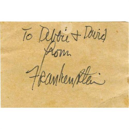 <B>Glenn Strange Signed Universal Card.</B></I> After playing the heavy in countess cowboy movies, Glenn Strange made the transition to horror movie icon with his performances as the Frankenstein Monster in <I>House of Frankenstein,</B></I> <I>House of Dracula,</B></I> and <I>Abbott and Costello Meet Frankenstein.</B></I> This autograph reads "To Debbie Glenn Strange Sam Gunsmoke" with Strange having added the the name of the bartender role he played for many years on the long-running TV Western. Two bonuses: Strange wrote the autograph on a 3.5" x 9" flyer for the Universal Studios tour (Universal, of course, was the studio that produced the Frankenstein melodramas), and the flyer is also signed "To Debbie and David from Frankenstein" -- presumably the studio employee who dressed up as the Monster on the Universal tour. (among the pictures inside the flyer, in fact, is one of the Monster signing autographs.) The flyer bears the copyright of 1972 (Strange died September 20, 1973). There is minor creasing on the flyer, and some light staining with a spot on the last letters of "Gunsmoke," otherwise it is in overall Very Fine condition. The signature of this former "Monster" is very desirable, especially in this uniquely apropos form. <I>Accompanied by LOA from PSA/DNA.</B></I><BR><BR><b>Shipping:</b> Flat Material, Small (<a target="_blank" href="http://www.heritageauctions.com/common/shipping.php">view shipping information</a>)