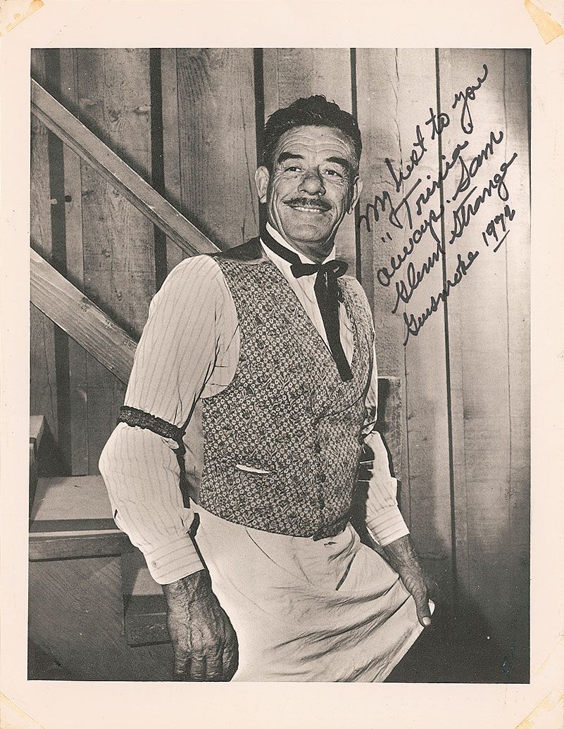 Actor (1899–1973) who, after appearing in a string of westerns, became better known as Frankenstein’s monster after Boris Karloff declined to continue in the role he had created. Strange played the character in three films, but later gained his greatest fame for his role as bartender Sam Noonan in the durable TV western Gunsmoke. Rare 8.5 x 11 heavy paperstock photo of Strange as bartender Sam from Gunsmoke, signed and inscribed in black felt tip “My best to you ‘Tricia’ Always, Sam, Glenn Strange Gunsmoke 1972.” In fine condition, with three binder dings to right edge and toning to corners from previous mounting.