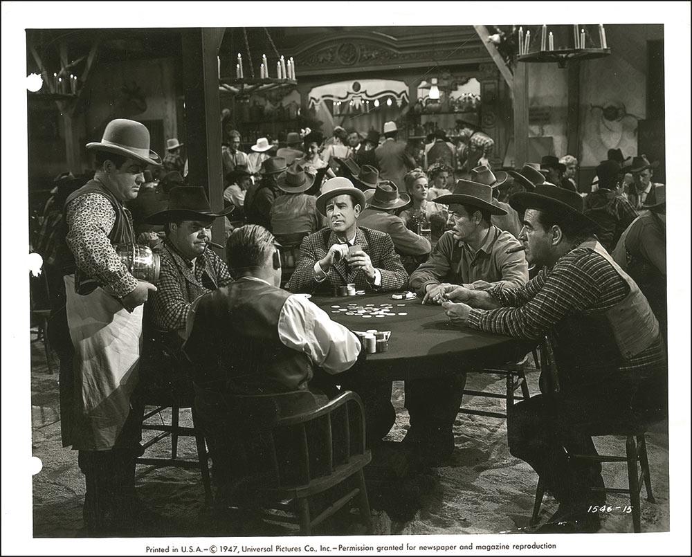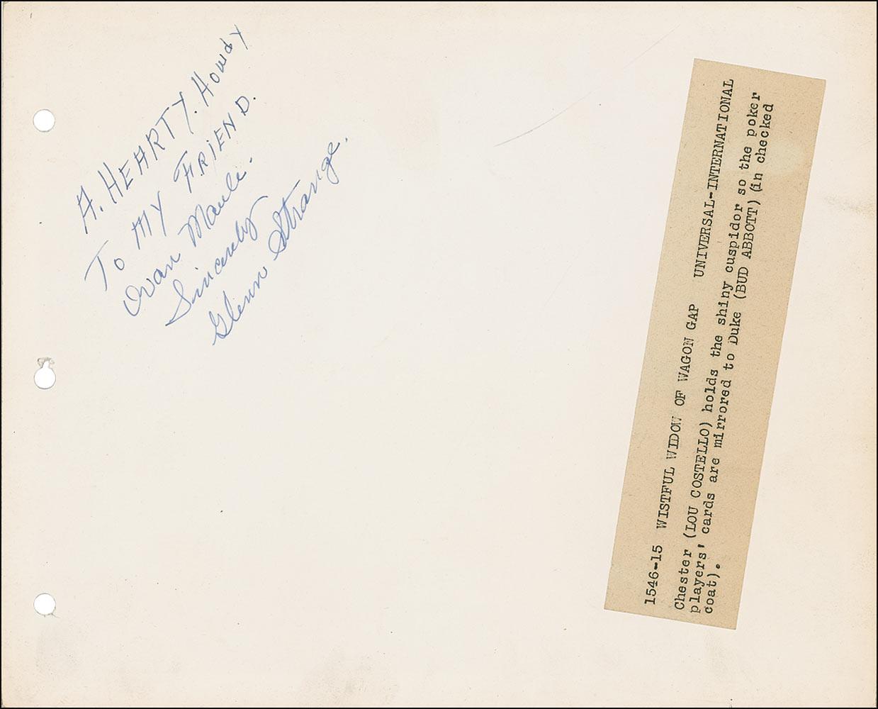 Actor (1899–1973) who, after appearing in a string of westerns, became better known as Frankenstein’s monster after Boris Karloff declined to continue in the role he had created. Strange played the character in three films, but later gained his greatest fame for his role as bartender Sam Noonan in the durable TV western Gunsmoke. Vintage glossy 10 x 8 Universal promotional photo from The Wistful Widow of Wagon Gap, signed and inscribed on the reverse in fountain pen “A hearty howdy to my friend Ovan Maule. Sincerely, Glenn Strange.” A promotional caption is also affixed to the reverse. In fine condition, with three punch holes to left edge, scattered light surface marks, creases, and impressions to image side, and a bit of scattered mild toning to reverse.