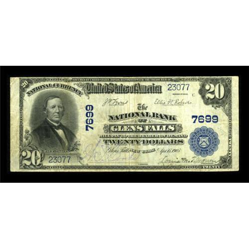 <B>Glens Falls, NY</B></I> - $20 1902 Plain Back Fr. 650 <B>The NB of Glen Falls</B></I> Ch. # 7699<BR> A decent large example from this somewhat scarcer Glens Falls bank. <B>Fine+.</B></I><BR><I>From The Thomas A. Bergin Collection</B></I><BR><BR><b>Shipping:</b> Coins & Currency (<a target="_blank" href="http://www.heritageauctions.com/common/shipping.php">view shipping information</a>)