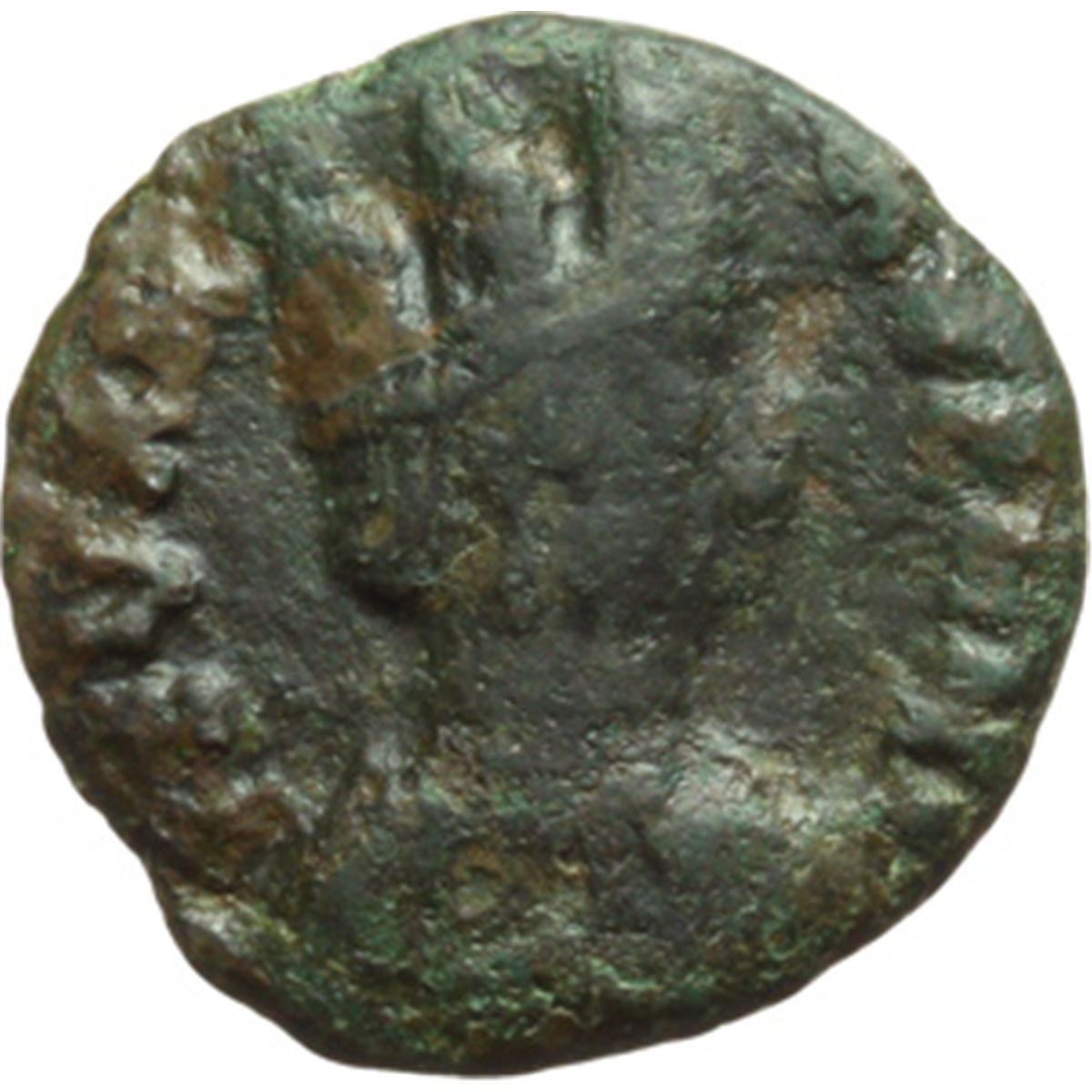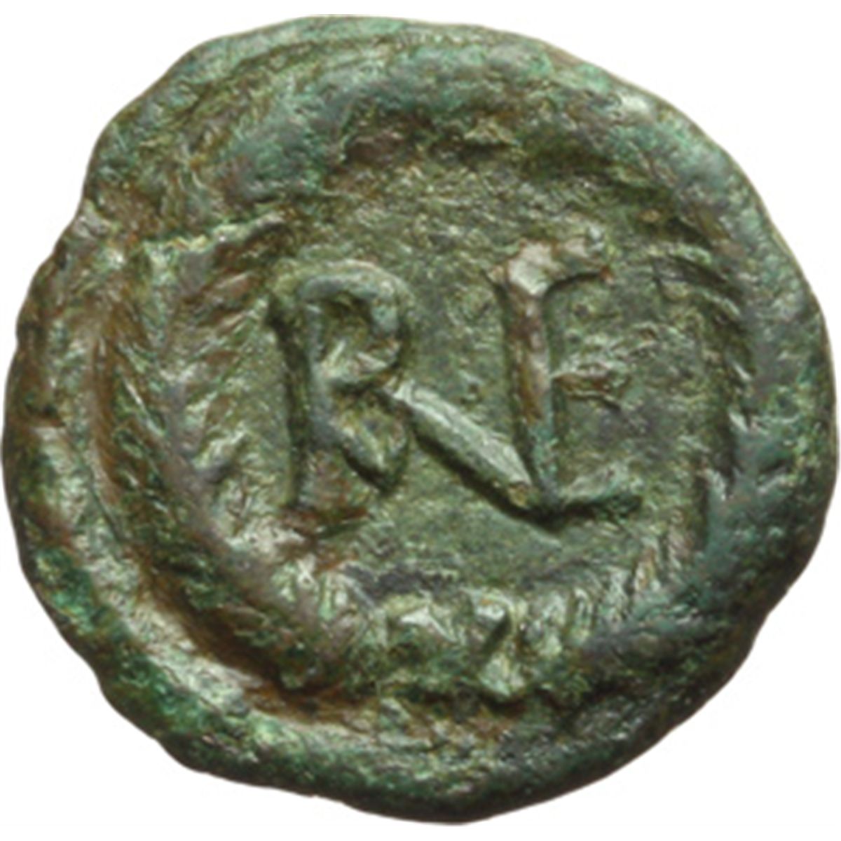 Monete Barbariche. Gli Ostrogoti in Italia. Decanummo, Ravenna, 518-540. D/ FELIX RAVENNA. Busto turrito e drappeggiato della Cittv† a destra. R/ Monogramma di Ravenna entro corona di lauro. Cfr. Ranieri 273. AE. g. 2.50 mm. 15.50 qBB/SPL.