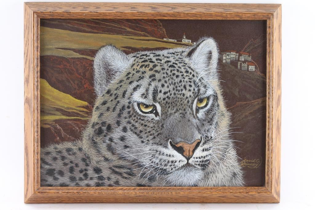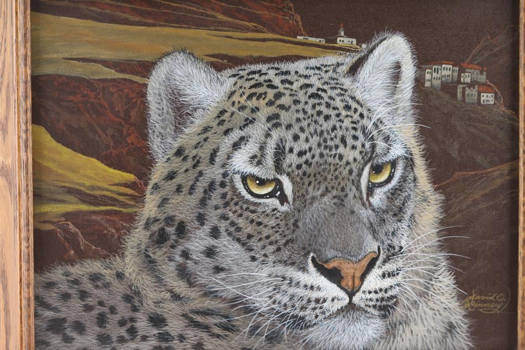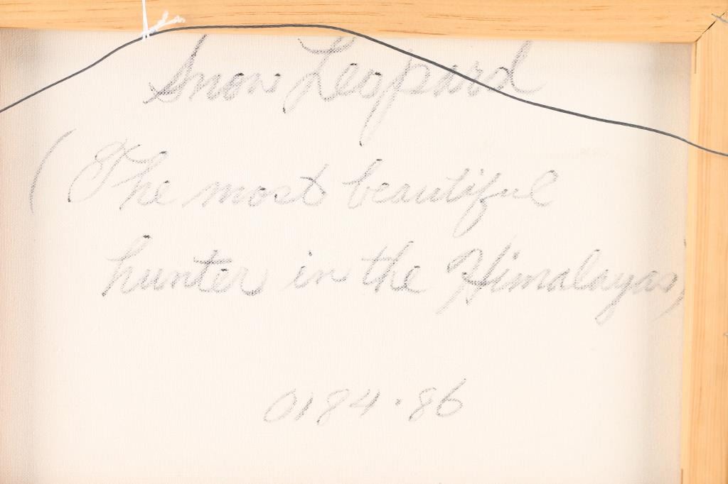 Titled (on back), "Snow Leopard (The most beautiful hunter in the Himalayas)". Gliclee print is signed in lower right corner. Measures 15 1/2" x 11 1/2". Wood frame is 2" deep.