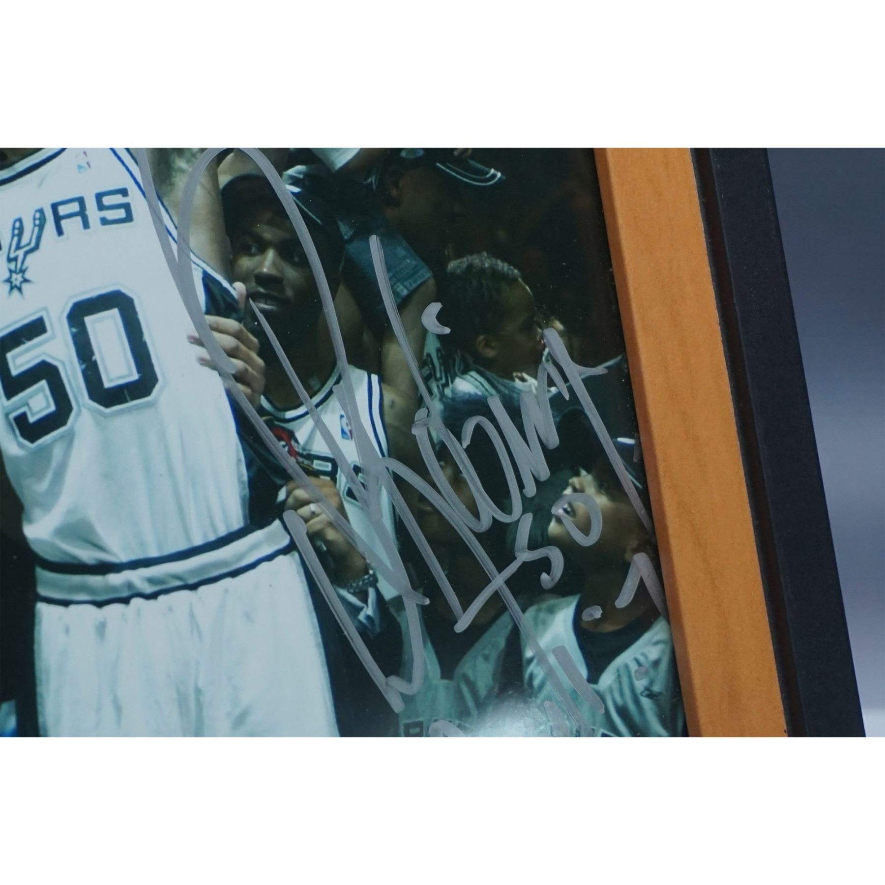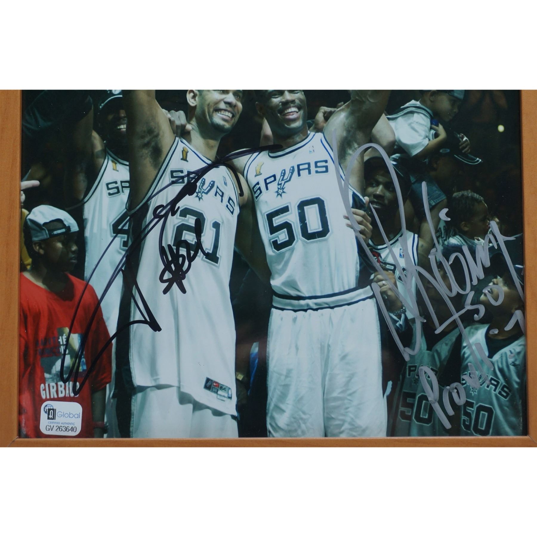 This 8" x 10" photograph captures San Antonio Spurs legends David Robinson and Tim Duncan celebrating a championship victory. Both players have signed the photo, with authentication provided by Global Authentics. The image is professionally framed, measuring 9.5"L x 11.5"H, making it an ideal collectible for Spurs fans and basketball memorabilia collectors. The photograph highlights a historic NBA moment, showcasing the iconic duo that led the Spurs to multiple championships.